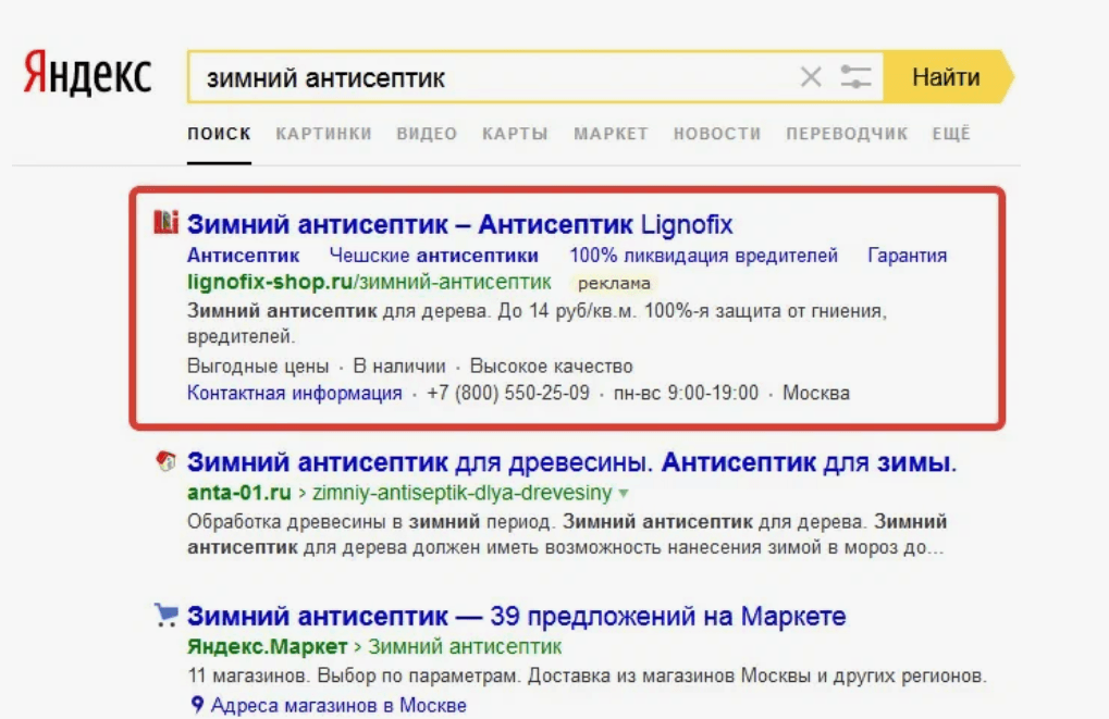 Раньше рекламные объявления Яндекс Директа в выдаче помечал помечал довольно заметным знаком «Реклама». Вот как это выглядело.