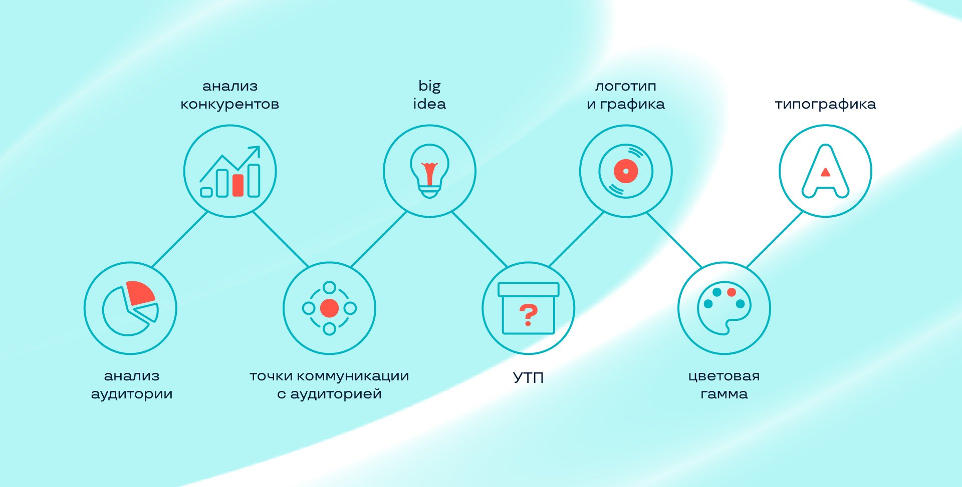 Разработка айдентики — процесс не быстрый и состоит из нескольких этапов: