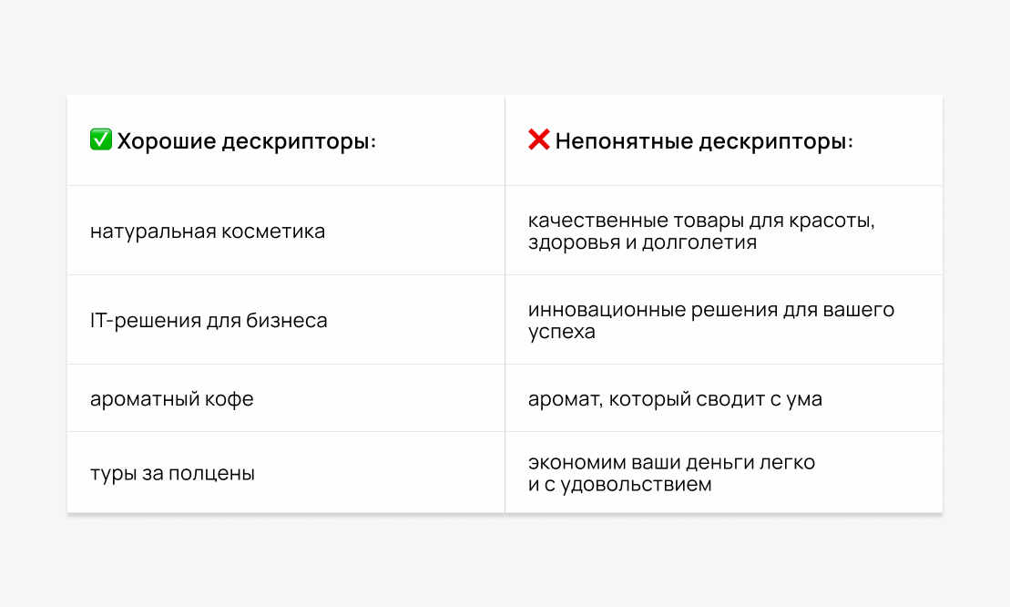 1. Опишите деятельность компании максимально просто и чётко. Дескриптор помогает ЦА быстро отнести бренд к той или иной категории. Поэтому он должен давать ответ на вопрос «Чем занимается компания?». На первом этапе напишите слова и формулировки, которые понятно и конкретно отражают суть вашей деятельности. Оптимально два-три слова, в крайнем случае — не более пяти.