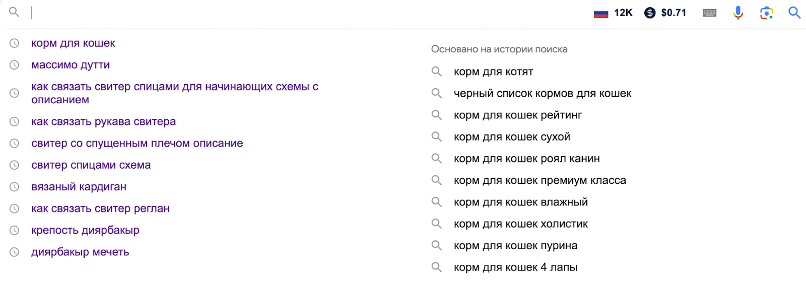 Совсем другой подход — подойти к работе с подсказками с другой стороны и включать в семантическое ядро фразы, которые уже популярны и показываются при поиске.