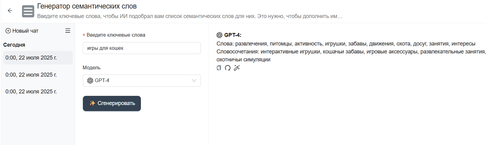 В этом вам поможет Генератор семантических слов. Введите ваши ключевые слова, а ИИ подберет список семантических слов для них.