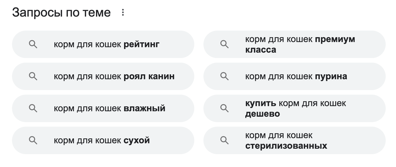 Фразы подсказок можно найти в конце страницы выдачи в блоке «Люди ищут» в Яндексе и «Запросы по теме» в Google.