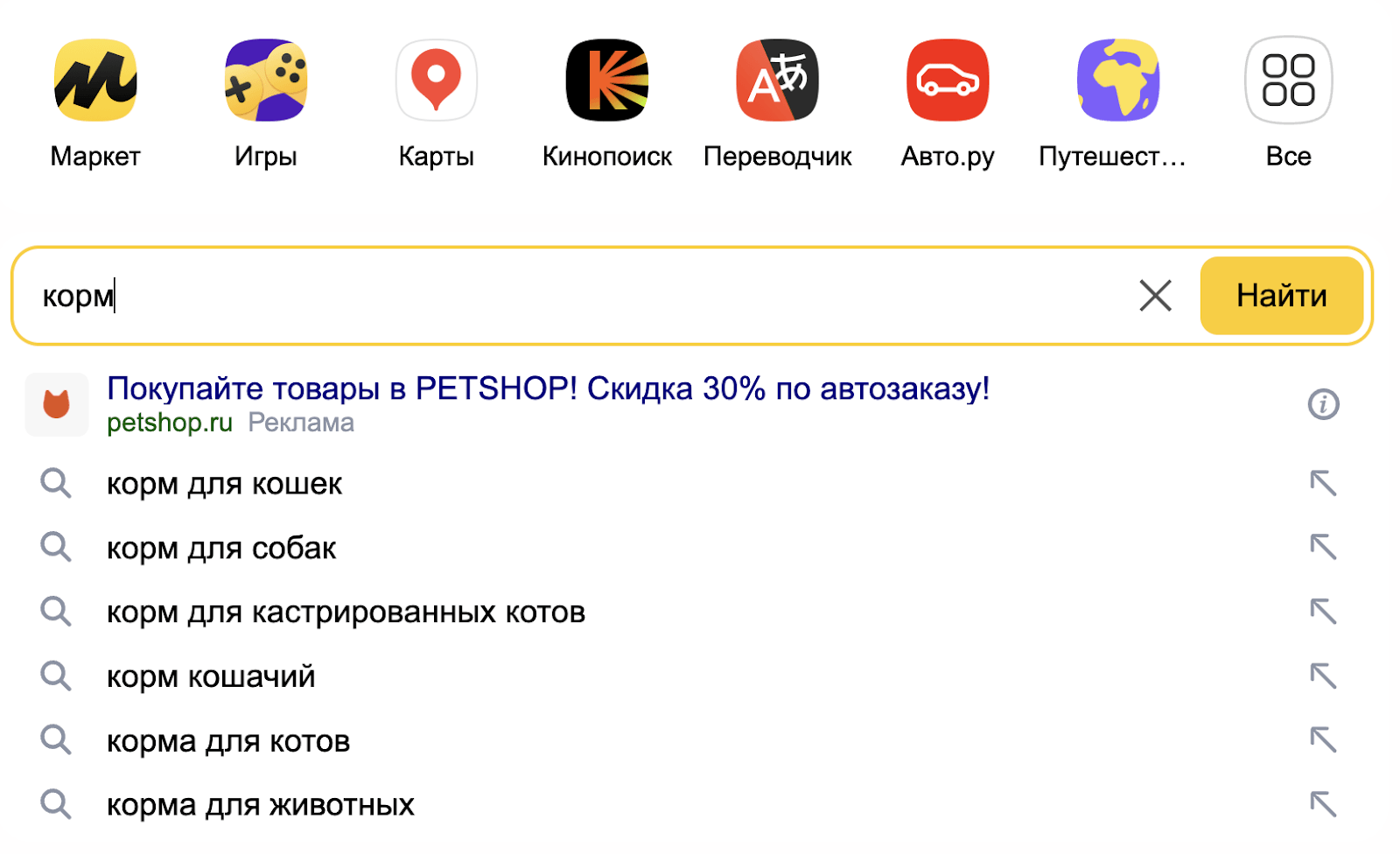 Ее показывают уже заинтересованной аудитории в самом начале выпадающего списка. Это более эффективно, чем обычная реклама на поиске, потому что объявление всего одно и оно перехватывает пользователей до того, как они начнут выбирать среди «синих ссылок».