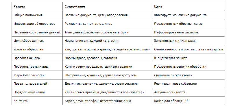 Политика конфиденциальности описывает: какие данные собираются, зачем это делается, как данные обрабатываются и защищаются, и какие права есть у пользователя.