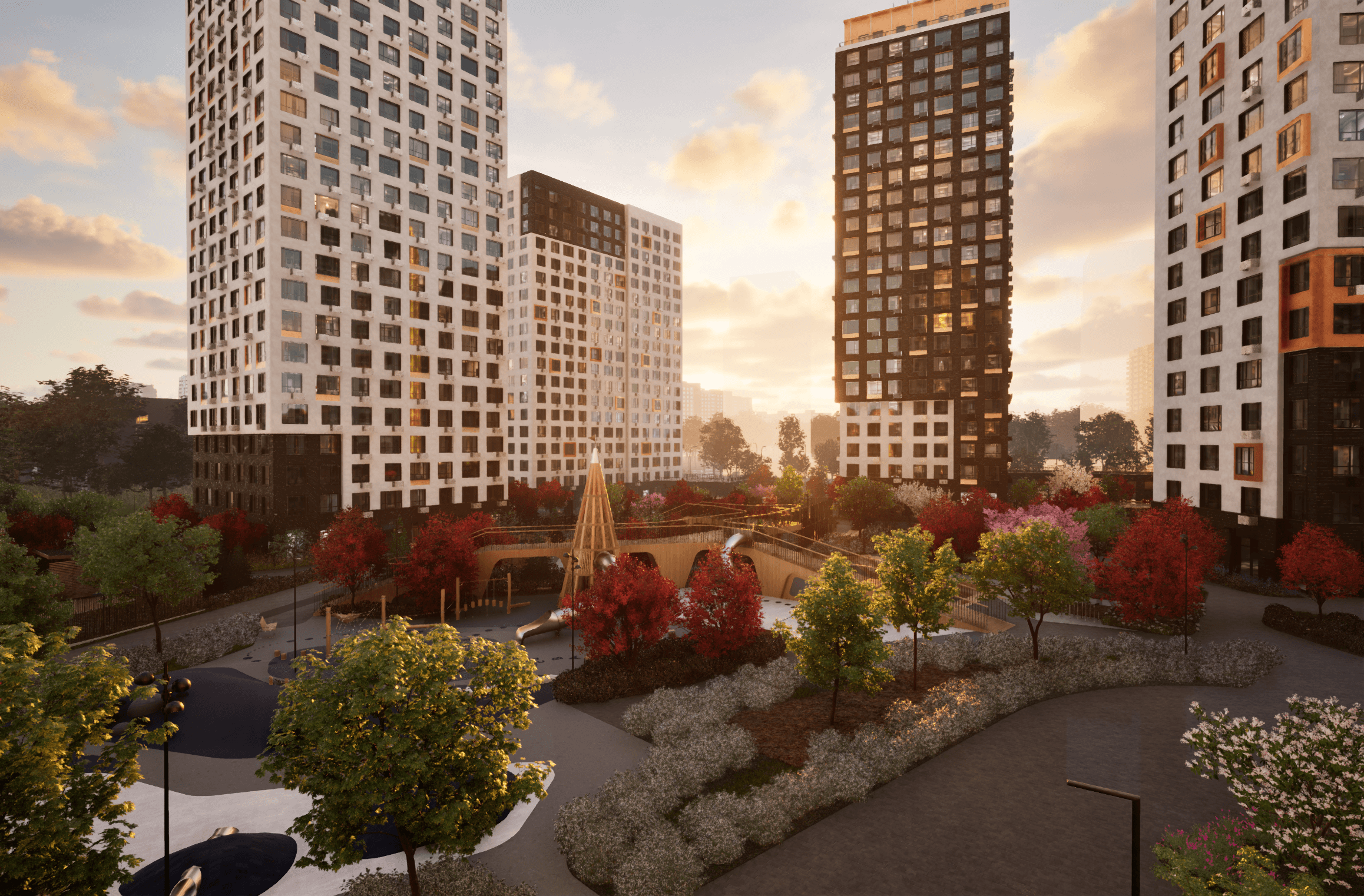 Для коттеджного посёлка рендер играет особую роль: здесь покупатель оценивает не только дом, но и окружение – дороги, зоны отдыха, наличие охраны, близость соседей, вид из окон и прочие ключевые параметры. Визуализация демонстрирует концепцию посёлка целиком: как коттеджи сочетаются друг с другом, где расположены зоны общего пользования и как организована территория. В сегменте индивидуального жилищного строительства клиенты часто хотят адаптировать проект под себя, поэтому востребованы не только статичные изображения, но и интерактивные 3D-решения с возможностью менять отделку, планировку и обустройство двора. На примере ЖК “Мечта”, для которого компания Playestate создала полноценную виртуальную прогулку с полным погружением в проект и возможностью смены дизайна. ССЫЛКА НА ПРОЕКТ МЕЧТА