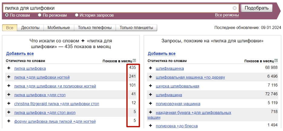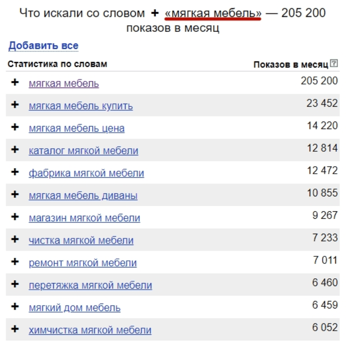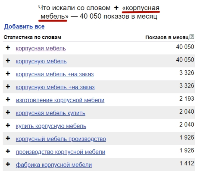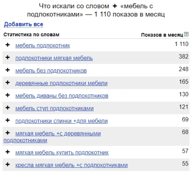 Добавляйте к запросам только те термины, которые соответствуют вашей сфере деятельности. Если у вас есть возможность изготовления изделий на заказ, включайте фразу «на заказ». Не старайтесь охватить семантику, по которой у вас нет предложений.