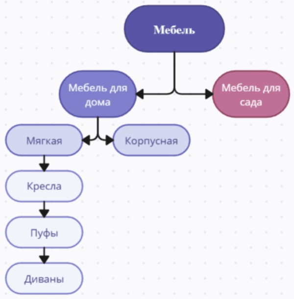 Удостоверьтесь, что пользователи действительно используют такую формулировку, проверив результаты поиска. Вероятно, никто не вводит "кресла и пуфы", поскольку эти предметы мебели ищут отдельно. Следовательно, слова "кресло" и "пуф" могут быть использованы в качестве заголовков отдельных подкатегорий. Таким образом, структура может выглядеть следующим образом:
