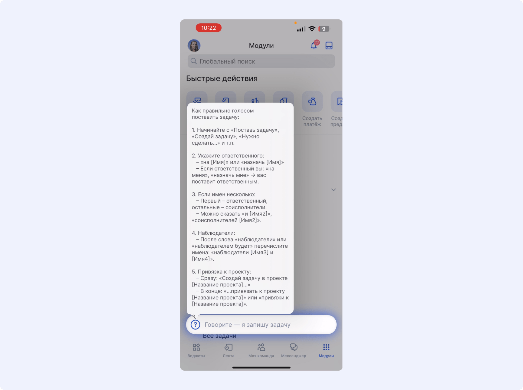 Постановка задач отнимает много времени, особенно при высокой нагрузке. Голосовое создание задач помогает фиксировать идеи сразу и снижает потери времени в течение дня.