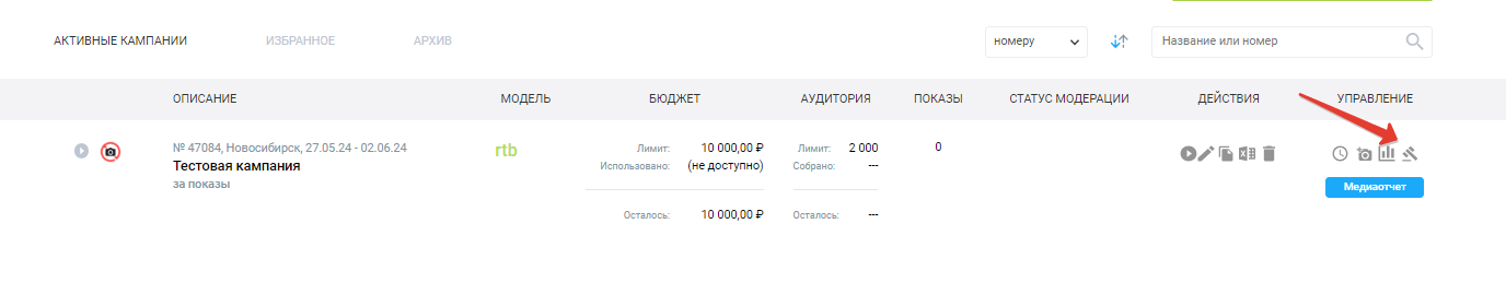 6. После запуска РК система перекинет на страницу со списком созданных рекламных кампаний. Чтобы перейти к настройке аукциона, нажимаем на молоточек в строке с нужной кампанией.