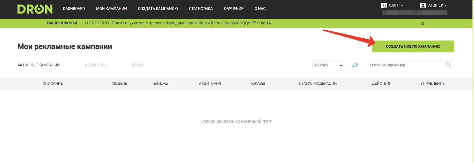 Чтобы запустить рекламную компанию через личный кабинет DRON, нужно: