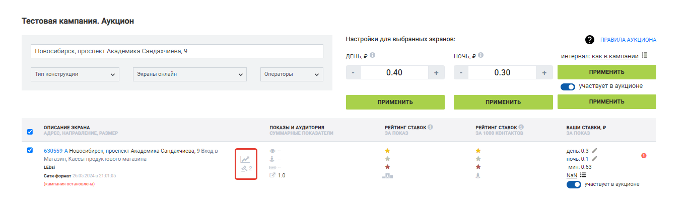 Возле каждого билборда здесь можно увидеть статистику показов (значок диаграммы) и формат аукциона (молоток с цифрой). Цифра 1 – аукцион первой цены, цифра 2 – второй цены.