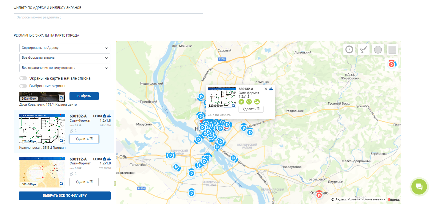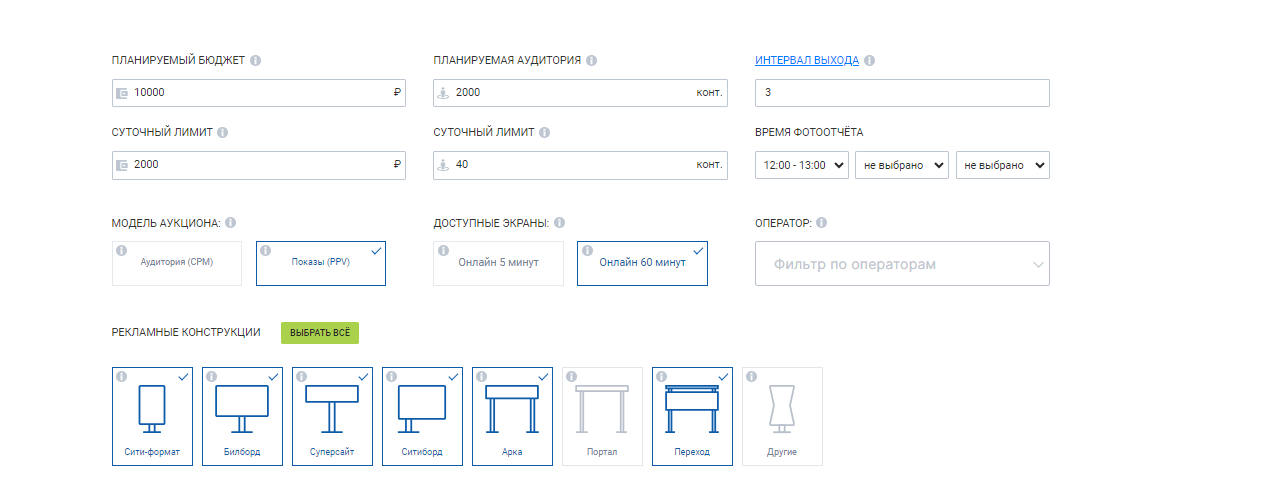 Здесь же нужно выбрать форматы рекламных конструкций – билборд, сити-формат и другие.