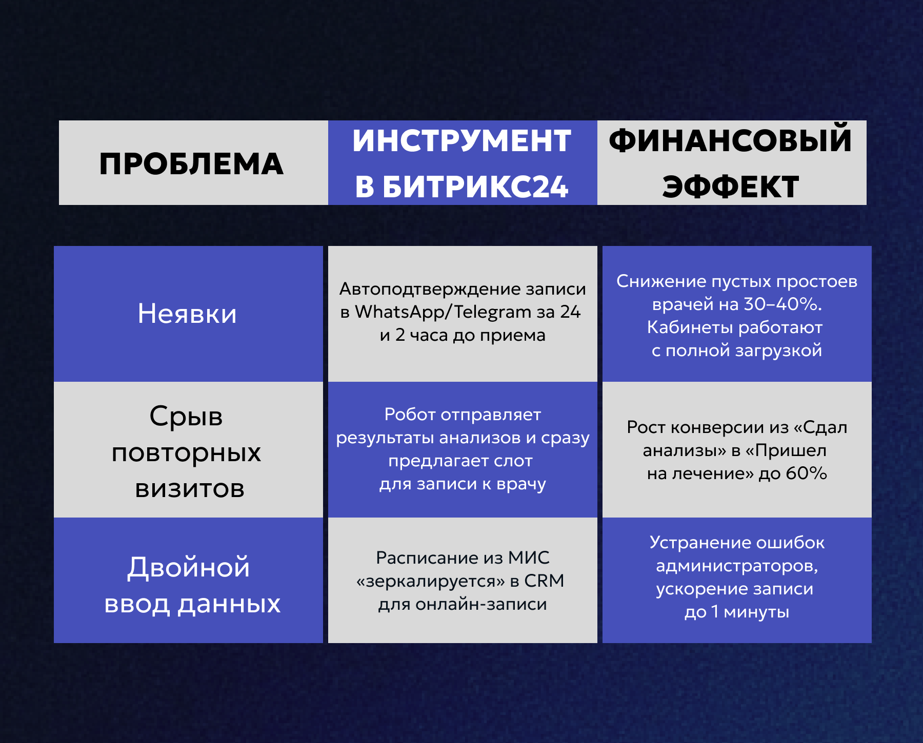 Решение проблемы это построение двухконтурной IT-архитектуры, где МИС отвечает за лечение, а CRM (Битрикс24) за коммуникацию и сервис. В этой статье мы разберем, как связать эти системы, чтобы автоматические напоминания снизили процент неявок, а роботы возвращали пациентов на повторные визиты, кратно увеличивая LTV.