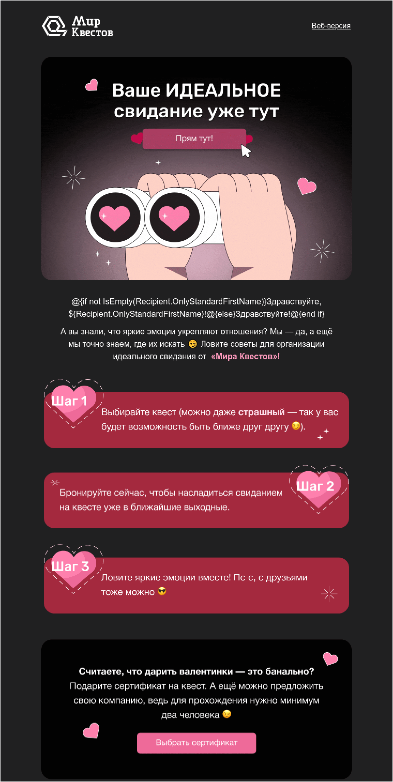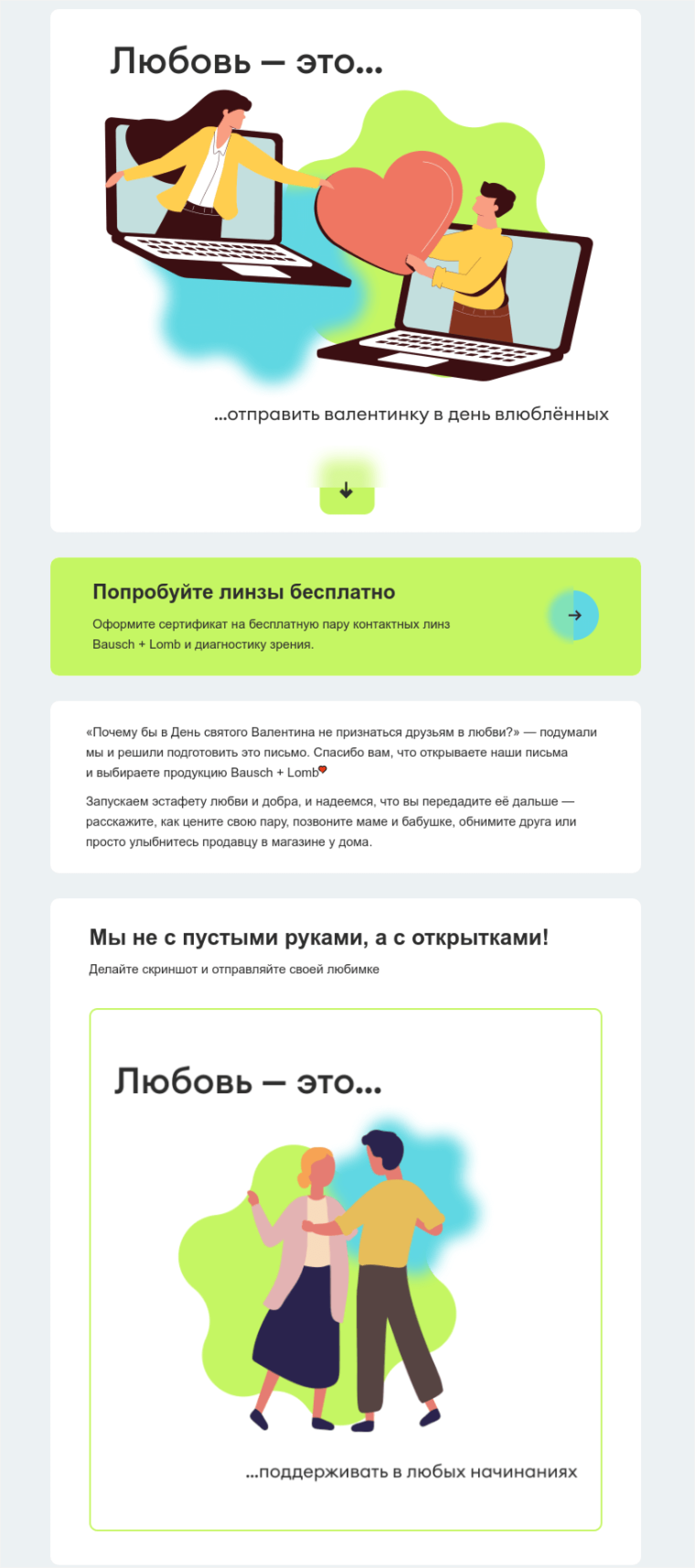 Например, «Бауш Ломб» использовал День святого Валентина как повод сказать спасибо своим клиентам. В дополнение в рассылке предложили сделать скриншот открытки из письма, чтобы порадовать близких. Такой подход показывает заботу о своих клиентах.