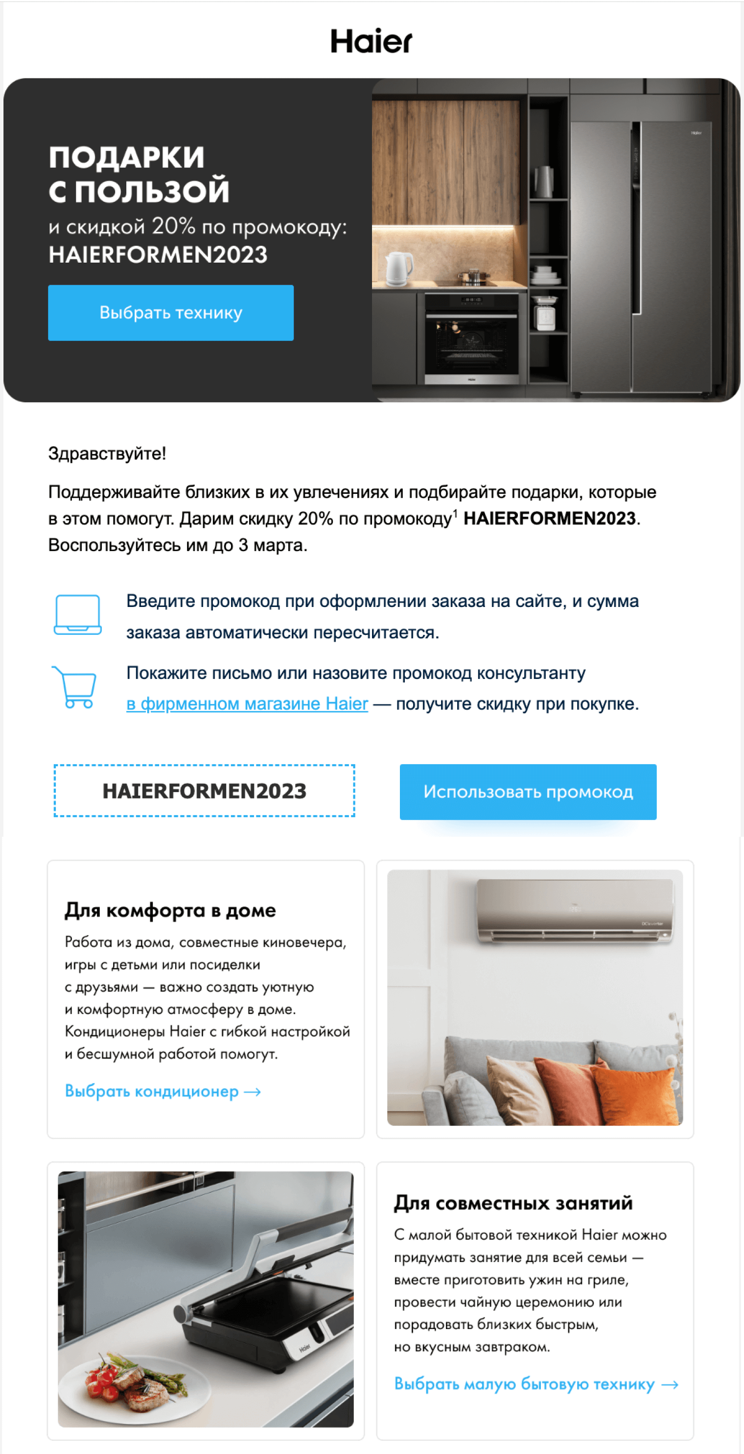 Так, Haier использует праздники прямо и без уловок: дарит подписчикам промокоды для мужчин и близких и при этом не растекается в поздравлениях.