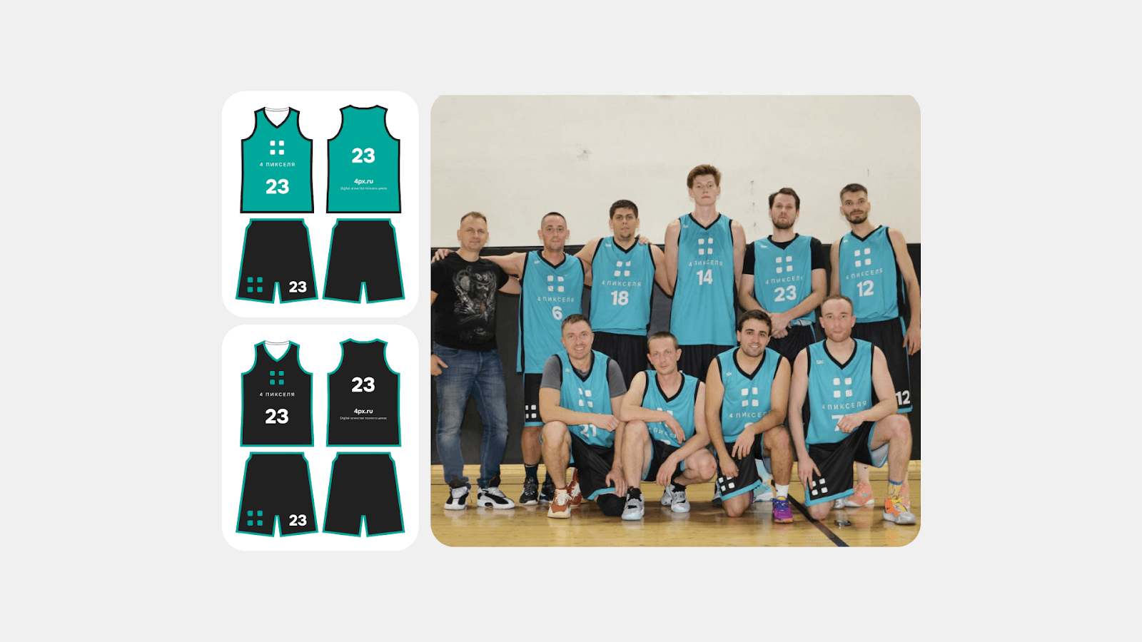 Использование мерча не ограничивается только welcome-паками. Брендированную продукцию можно дарить по различным поводам: корпоративные праздники, профессиональные достижения, повышение в должности, или даже в поддержку вне рабочих увлечений сотрудников. Например, мы в «4 Пикселя» разработали спортивную форму для корпоративной баскетбольной команды.