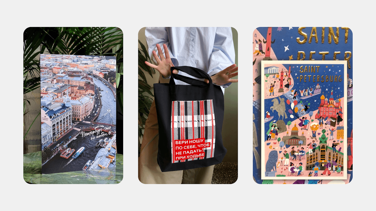 Книжный магазин «Подписные издания» создал свою собственную коллекцию сувениров. В ее ассортимент входят открытки с видами Санкт-Петербурга, объемные стикеры, обложки для паспорта, металлические значки с образами героев книг, шопперы и футболки с уникальными надписями, а также стильная упаковочная бумага.