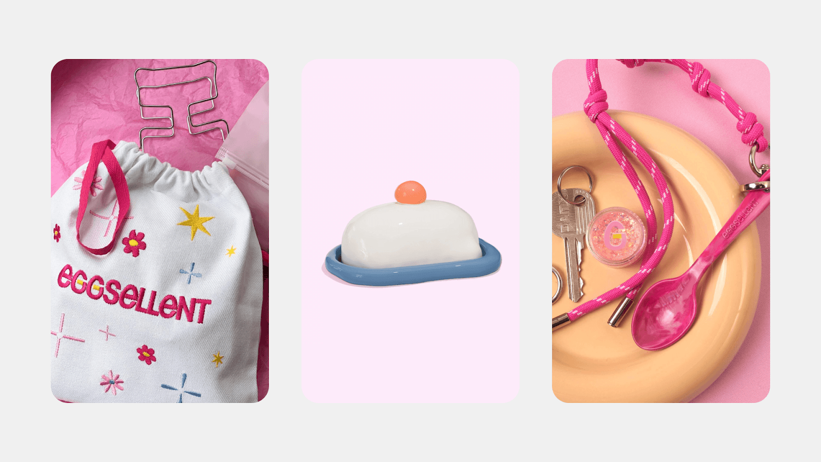 Кафе Eggsellent — это больше, чем просто место для завтрака. Уникальный бренд распространяется далеко за пределы его стен благодаря запоминающемуся мерчу. Eggsellent предлагает своим гостям и поклонникам неожиданные и интересные товары: керамическая масленка, игрушка на елку в виде яйца, блестящий сироп для коктейлей, блестки для лица и многое другое.
