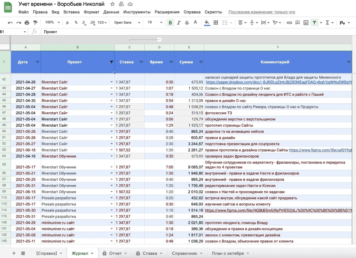 Проще всего было взять Google Таблицы, они бесплатные и легкие в использовании. Записи о работе начали вести в отдельных файлах: каждый член команды вносил данные о проекте, выполняемой задаче и времени, потраченном на это. Все расчеты производились автоматически благодаря формулам, которые мы настроили. Ставки и формы вознаграждения, будь то почасовая оплата или фиксированный оклад, могли варьироваться для разных сотрудников.