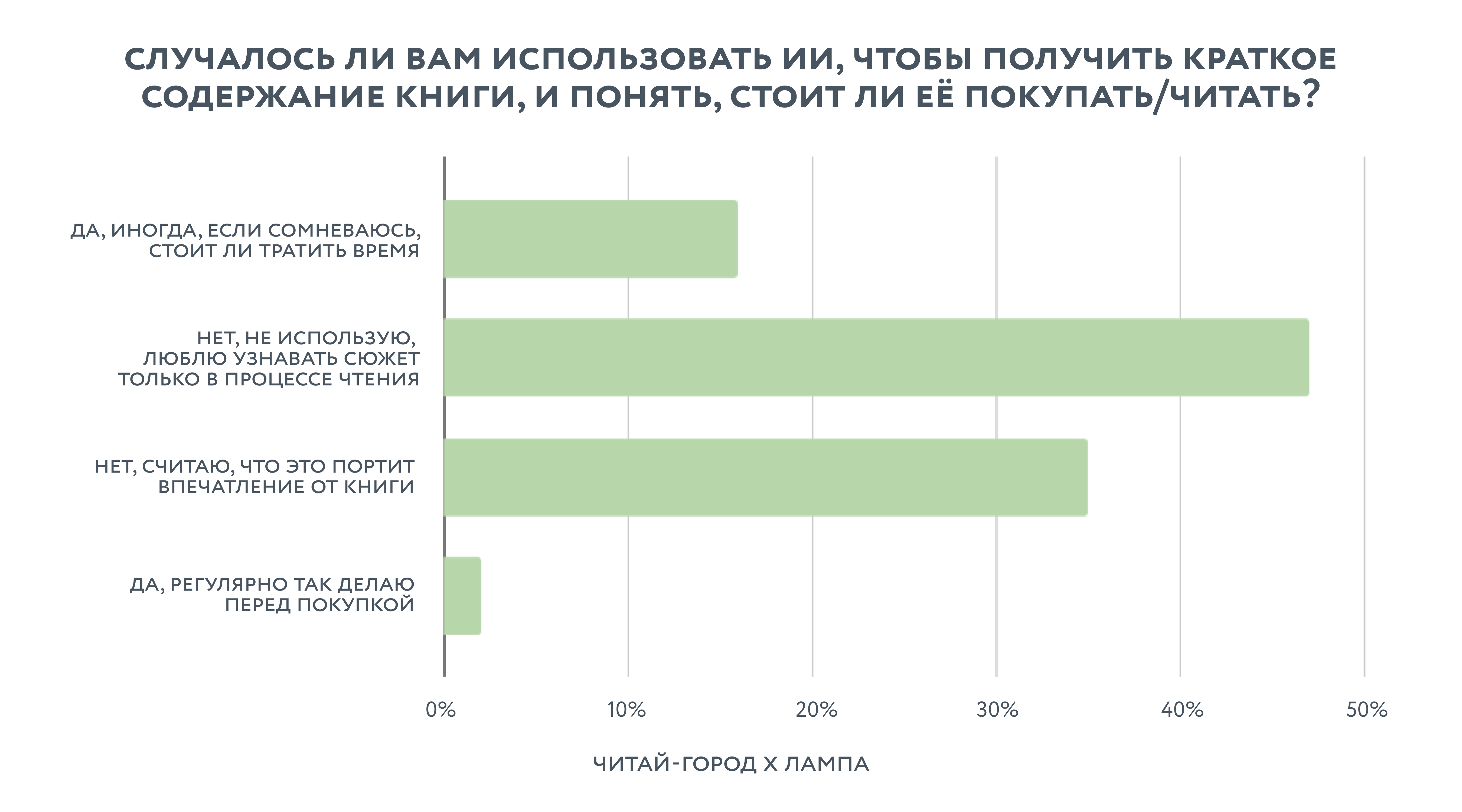Неожиданный поворот — в отношении к краткому содержанию. Несмотря на то, что 83% читателей против саммари от ИИ перед покупкой, чтобы не испортить впечатление, каждый шестой все равно его использует, чтобы получить краткое ревью — когда сомневается, стоит ли тратить время на прочтение. Люди не хотят спойлеров, но хотят экономить время и деньги, и нейросеть становится инструментом прагматичного выбора.