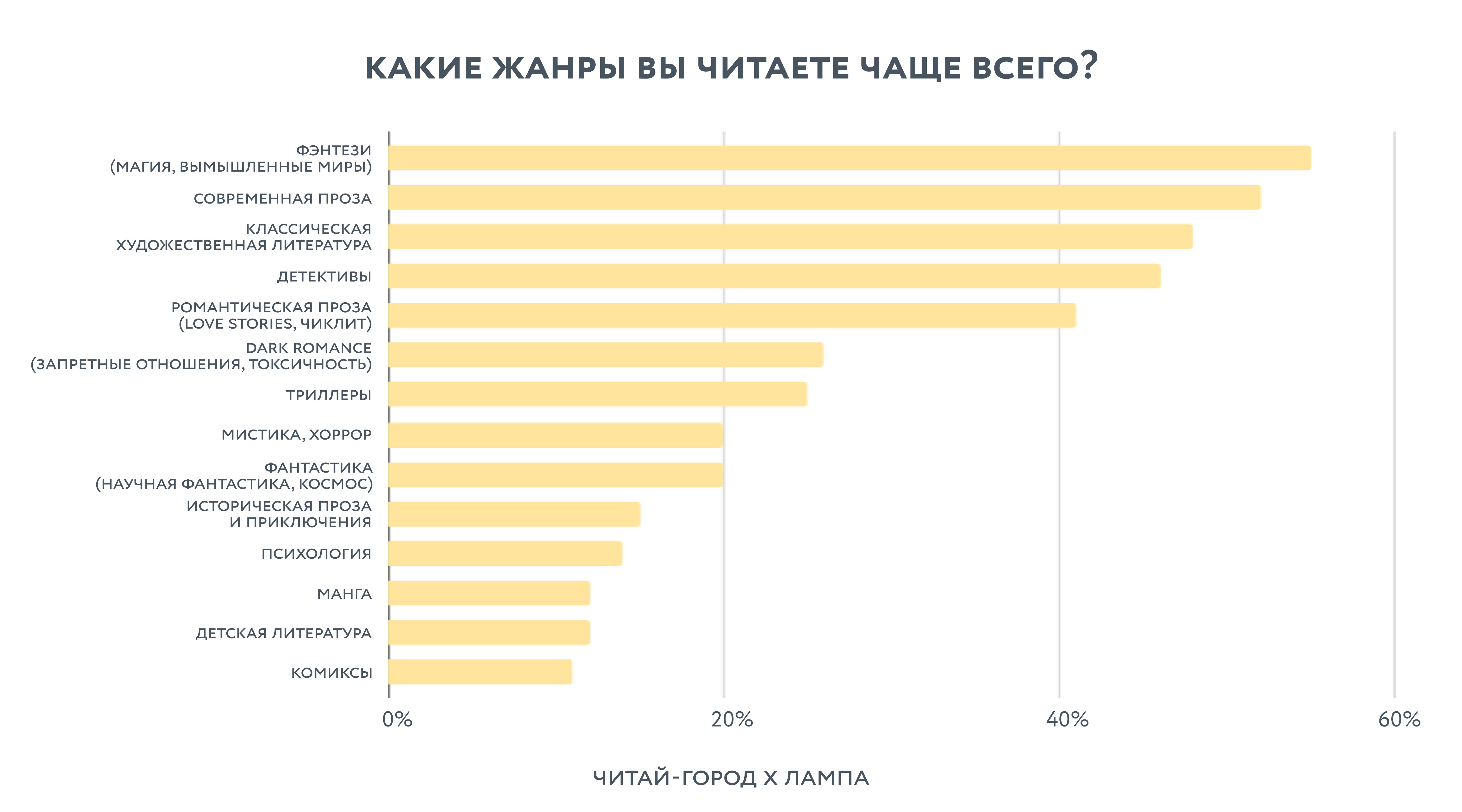 Самые популярные жанры у россиян — фэнтези (55%), современная проза (52%) и классическая художественная литература (48%). То есть классика и современные авторы сохраняют высокие позиции, однако фэнтези уверенно лидирует: магические миры и вымышленные вселенные привлекают аудиторию больше, чем реальность.