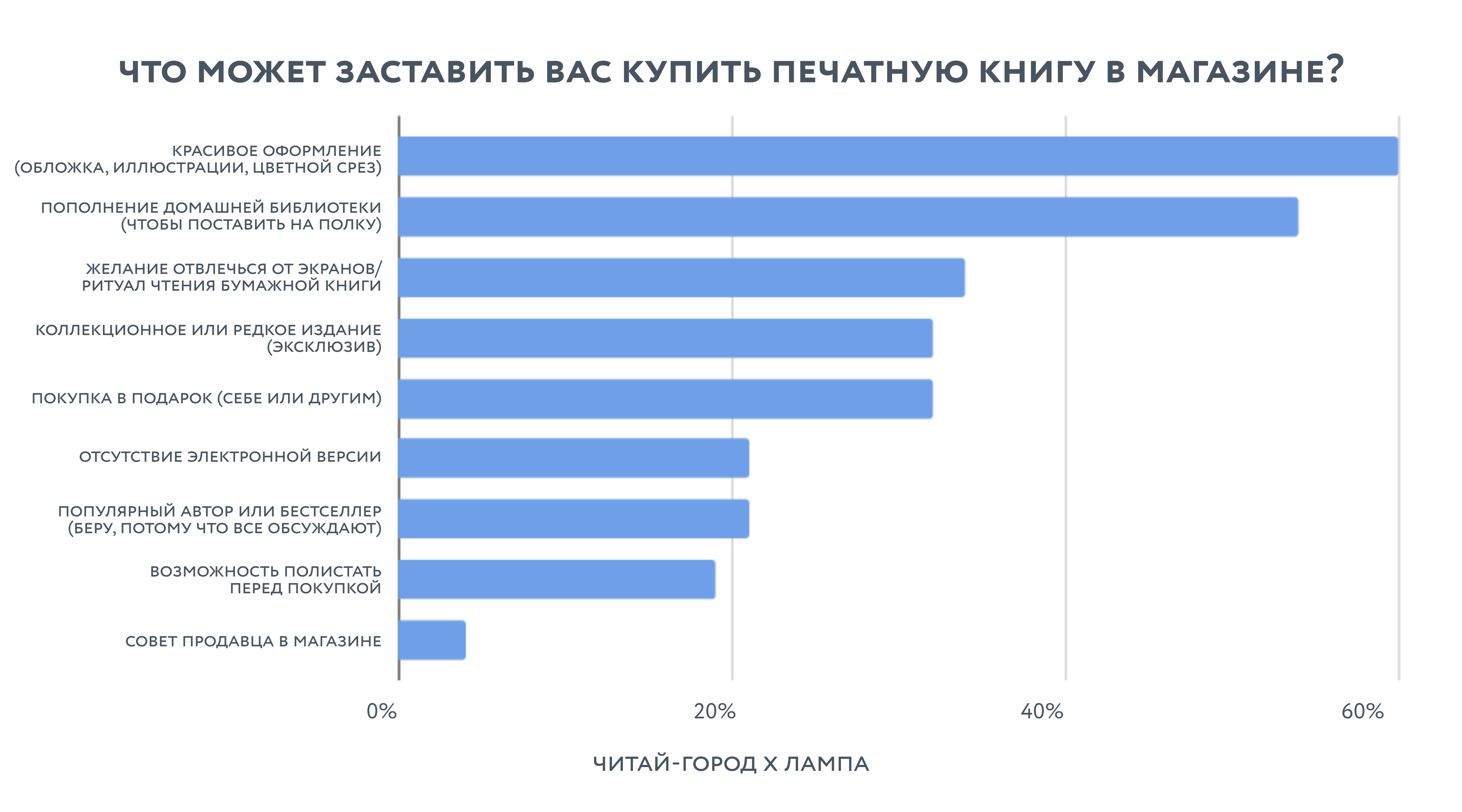 Визуальное впечатление становится решающим фактором покупки. 60% читателей признались: красивая обложка, цветной срез или необычное оформление могут заставить их купить книгу сразу. Совет консультанта в магазине при этом теряет прежнюю силу — он важен лишь для 4% покупателей.