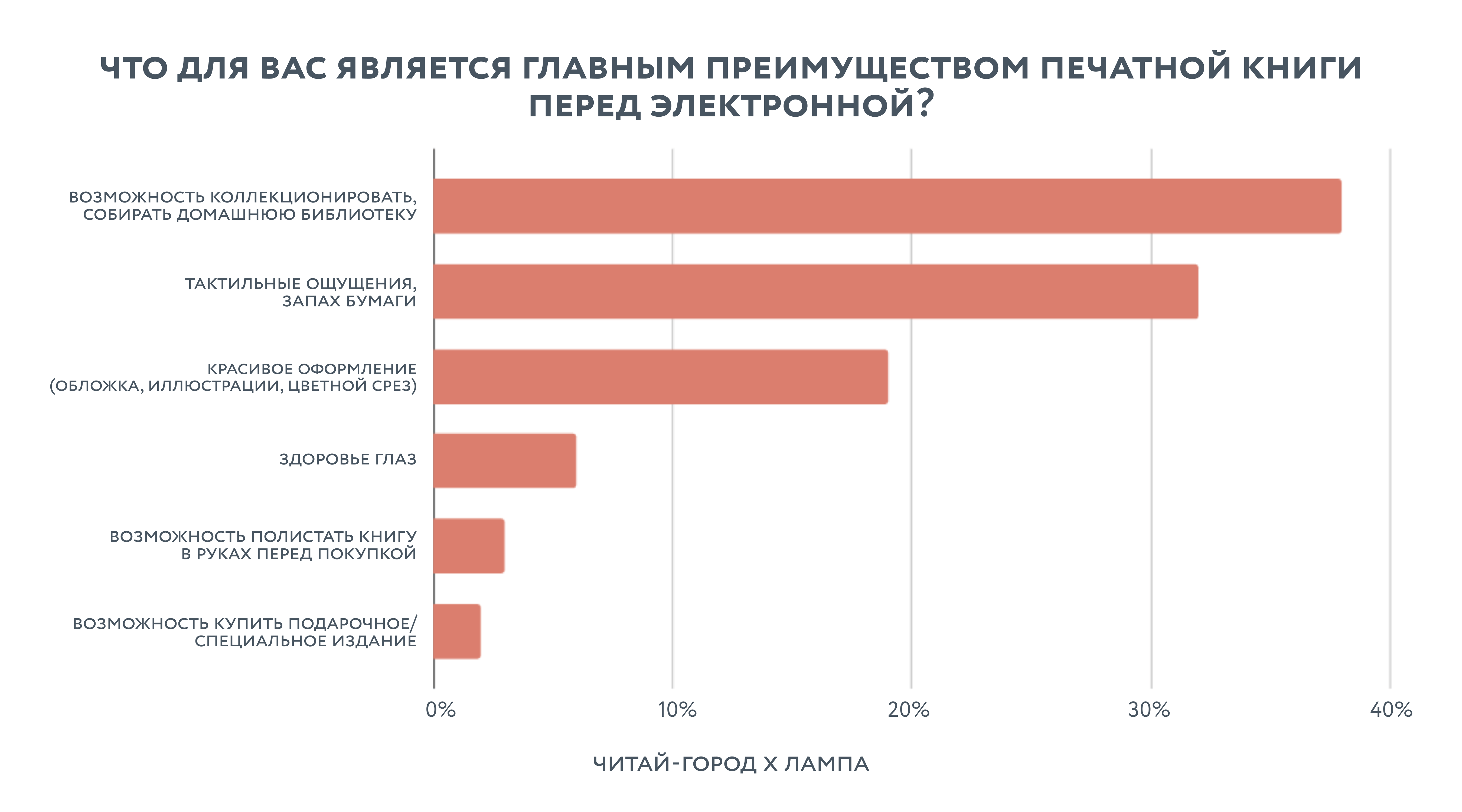 Принято считать, что люди продолжают покупают бумажные книги, потому что любят их запах и тактильные ощущения, но исследование показывает другое. Тактильные ощущения и запах бумаги действительно важны — для трети читателей. Но почти 40% опрошенных покупают бумажные книги, потому что хотят их коллекционировать. Возможность собрать домашнюю библиотеку, поставить книгу на полку, владеть физическим экземпляром — вот что на самом деле движет покупкой. Здоровье глаз, которое так любят упоминать в спорах об электронных книгах, волнует только 6%.