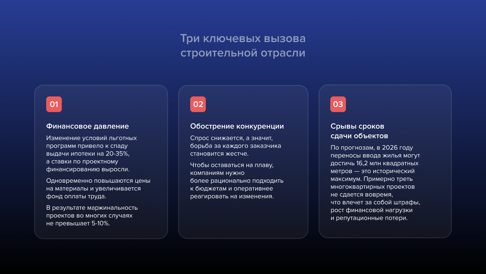 Наша регулярная рубрика, прежде всего ведется на основе анализа проблемных точек той или иной бизнес-отрасли. Почему строительство? Это одна из ключевых отраслей, переживающая период изменений, который затрагивает основы финансового управления компаниями. Текущая ситуация обнажает проблемы в учете затрат, что делает сферу приоритетной для рассмотрения. Можно выделить три ключевых вызова, с которыми столкнулись застройщики.