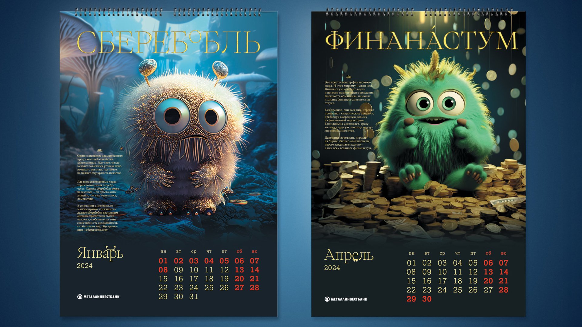 В 2023 году мы создавали для «Металлинвестбанка» календарь «Жители мира финансов», главными героями которого стали симпатичные фантастические персонажи, живущие в этом мире.