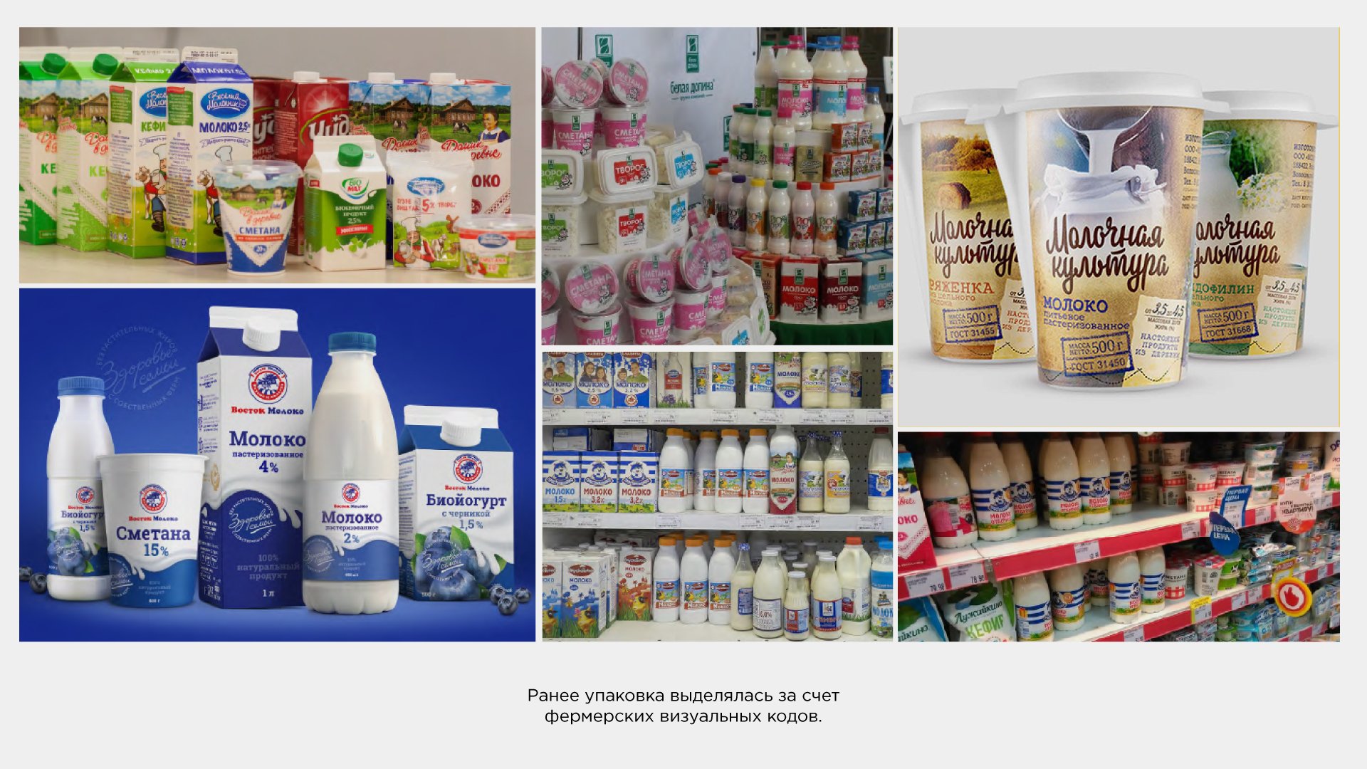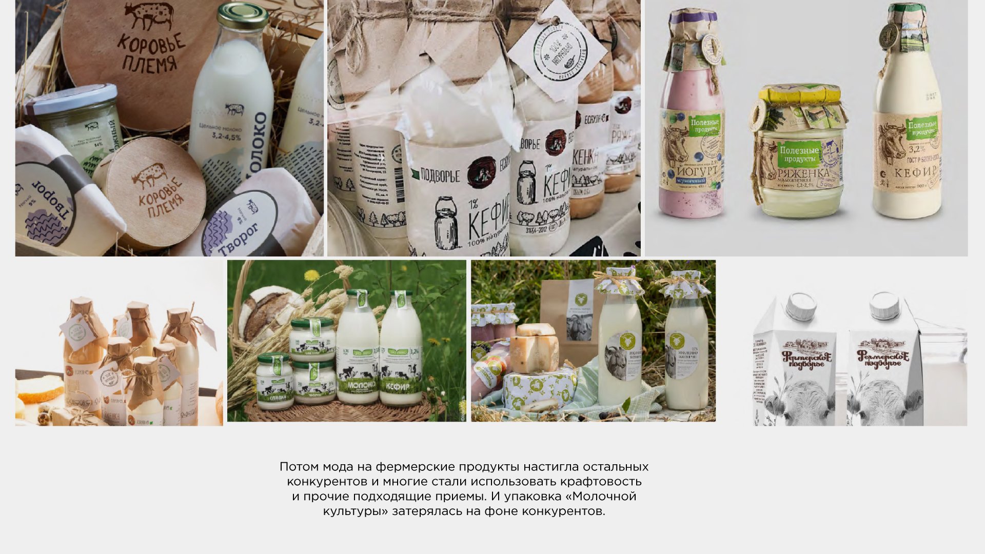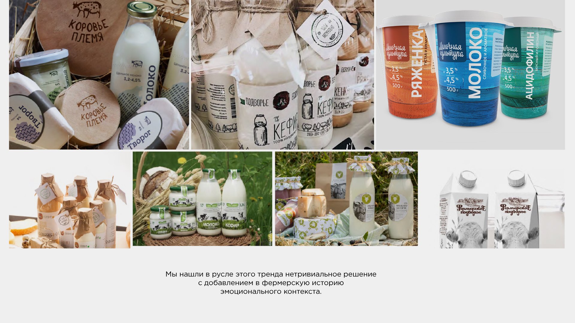 Или наш пример. Разрабатывая упаковку для продуктов бренда «Молочная культура», мы изучали реальные и виртуальные полки с фермерскими продуктами. И поняли, что попали в самый пик моды на крафтовое, экологичное, фактурное, вощеное и тому подобное. А студии Deza, оставаясь в подобных кодах, важно было не поддаться им безрассудно и полностью, добавив что-то нетривиальное, эмоциональное и ясное. Сделав это, нам удалось плыть в общем течении, но быть немного другими.