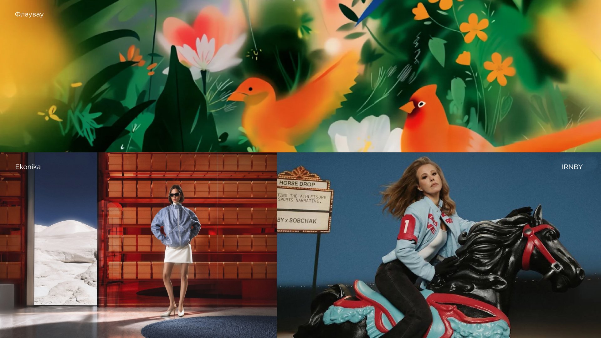 Здесь можно вспомнить и очень известный кейс ребрендинга «Флаувау», где вся иллюстративная айдентика создана благодаря нейросетям. И один из проектов IRNBY, где проморолик с Ксенией Собчак, посвященный новой коллекции, был умело создан руками нейрохудожницы Ксении Ливады. Или видео для компании «Эконика», при создании которого возможности ИИ позволили получить весьма интересный и динамичный результат.