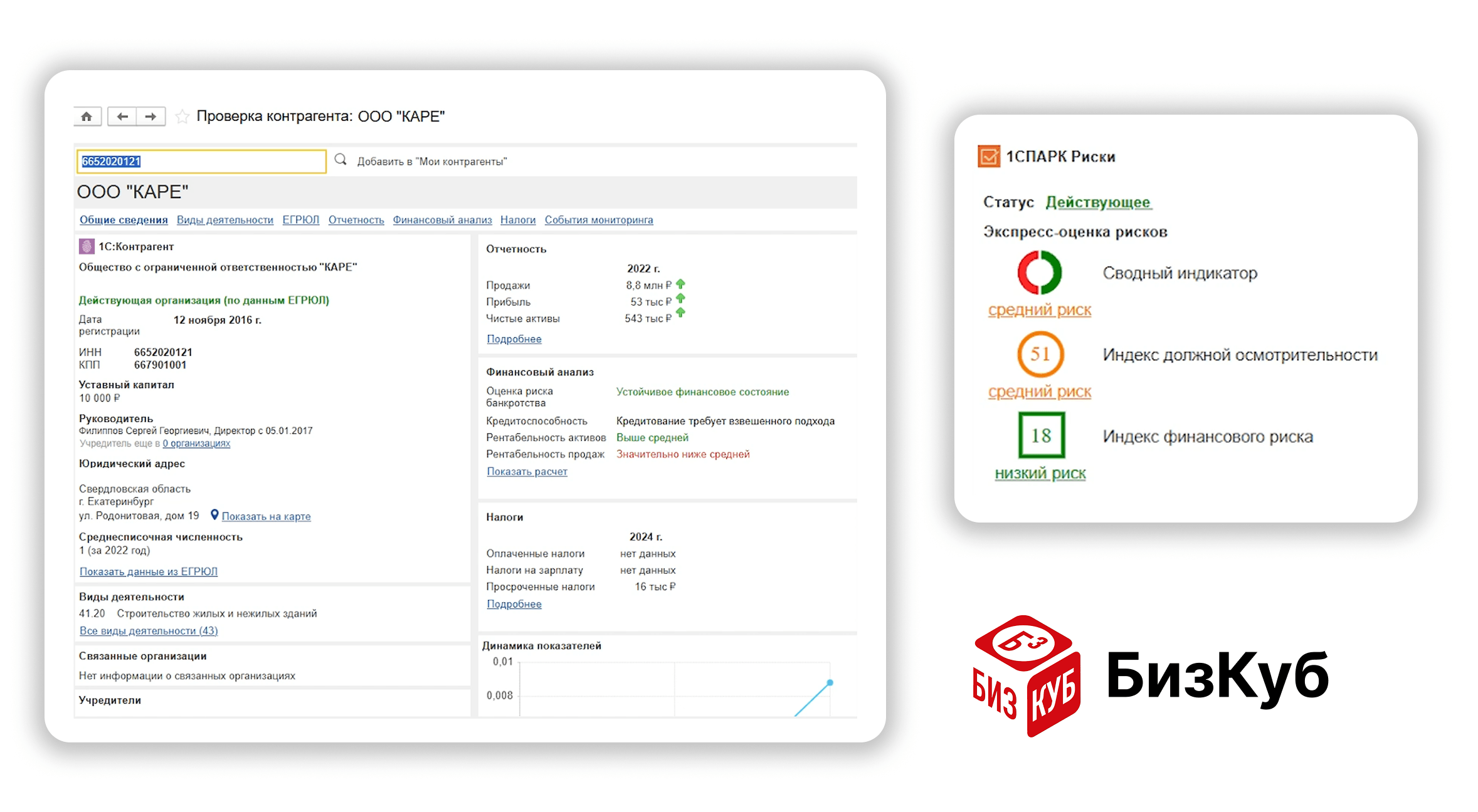 Также «БизКуб» проверяет контрагентов по базам сервиса «1СПАРК Риски» — он оценивает вероятность того, что компания является однодневкой или не сможет оплатить счета из-за проблем с финансами. Благодаря этому становится проще решить, стоит ли заключать договор.