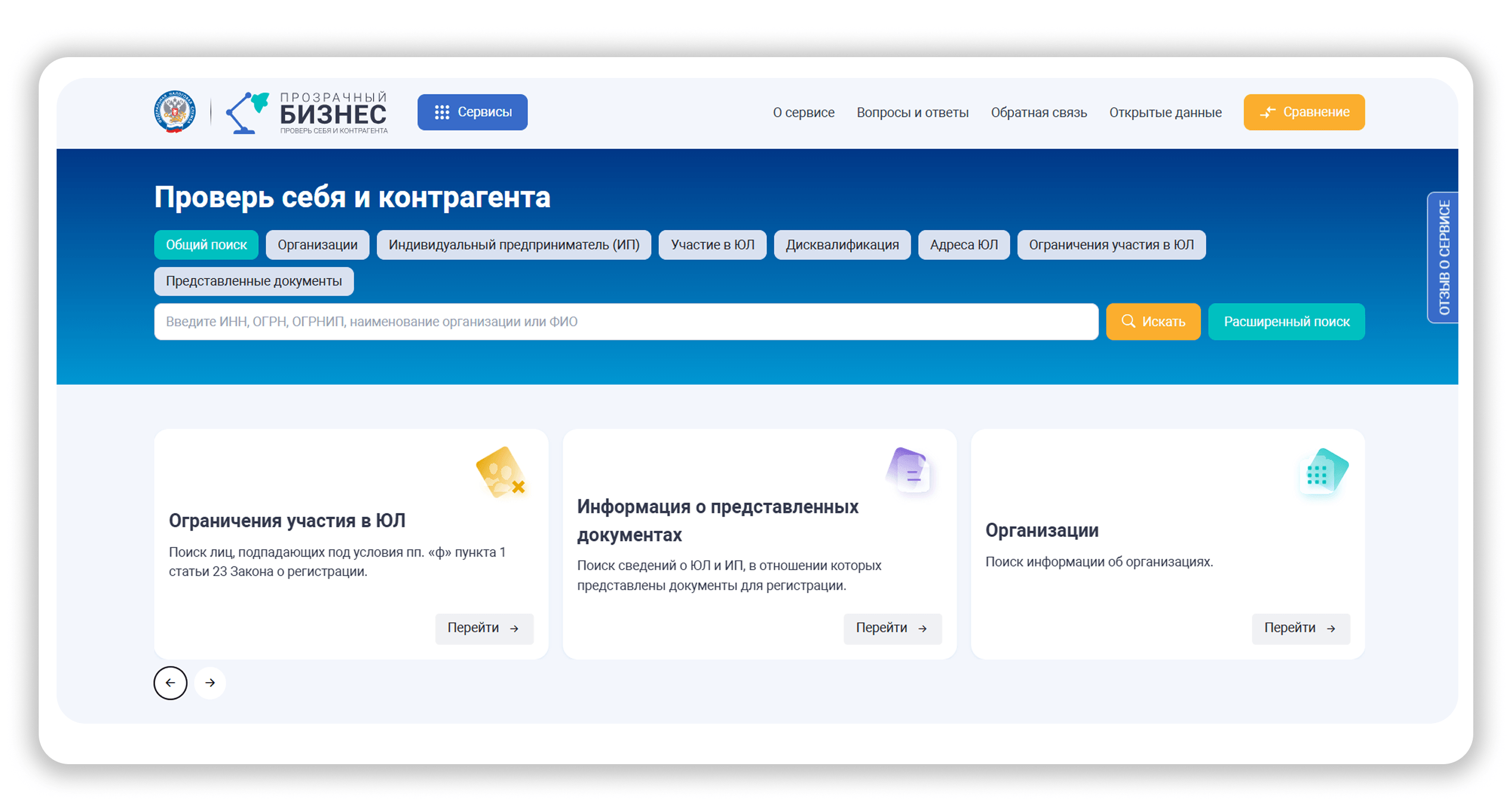 Узнать данные о добросовестности контрагента можно в официальном сервисе ФНС «Прозрачный бизнес». Это открытая система, где можно проверить основную информацию о деятельности юридических лиц и ИП. Для этого понадобится ИНН, ОГРН, ОГРНИП, наименование организации или ФИО предпринимателя.