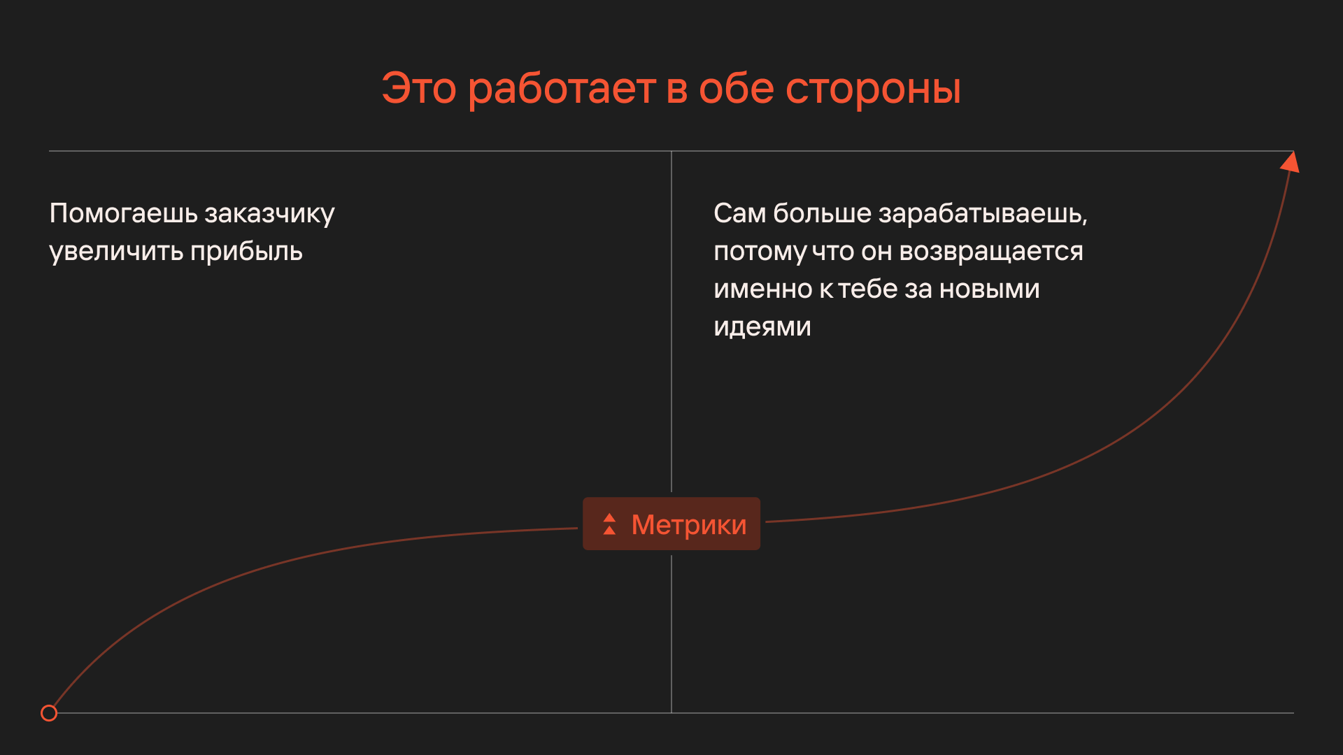 Классическая для нас история: во время работы клиент накидывает дополнительные задачи или, уже после, возвращается с новыми проектами. Мы думаем, как ещё улучшить продукт, внедряем новые идеи и даём свежий вижн. Бизнес-показатели клиента растут, метрики — с ними, а продукт приносит больше денег.