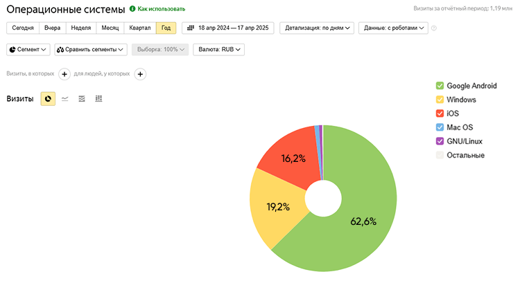 Данные из Яндекс.Метрики: распределение визитов по операционным системам