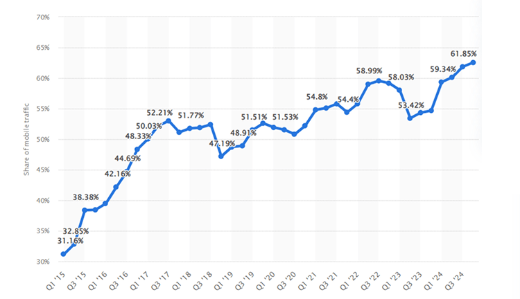 Процент посещаемости сайтов с мобильных устройств с 1-го квартала 2015 года по 4-й квартал 2024 года