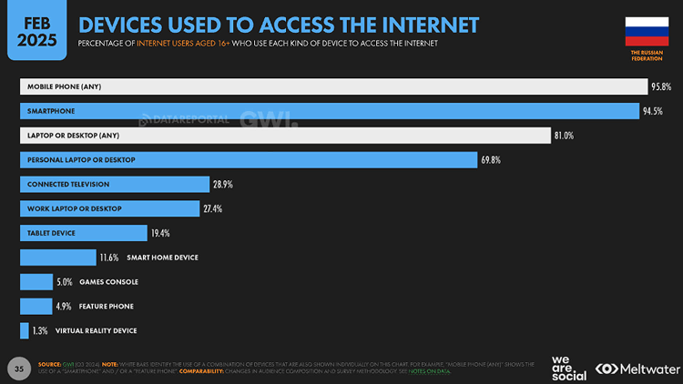Также DataReportal сообщает, что в России мобильные устройства продолжают доминировать. В 2025 году 95,5% интернет-пользователей выходят в сеть через мобильные телефоны.