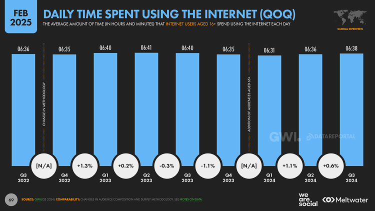 Согласно ежегодному отчету Global Digital Report помимо трафика, растет и глубина взаимодействия: взрослые пользователи интернета в среднем проводят в сети 6 часов 38 минут в день, из них почти 4 часа (3:56) — на мобильных устройствах.