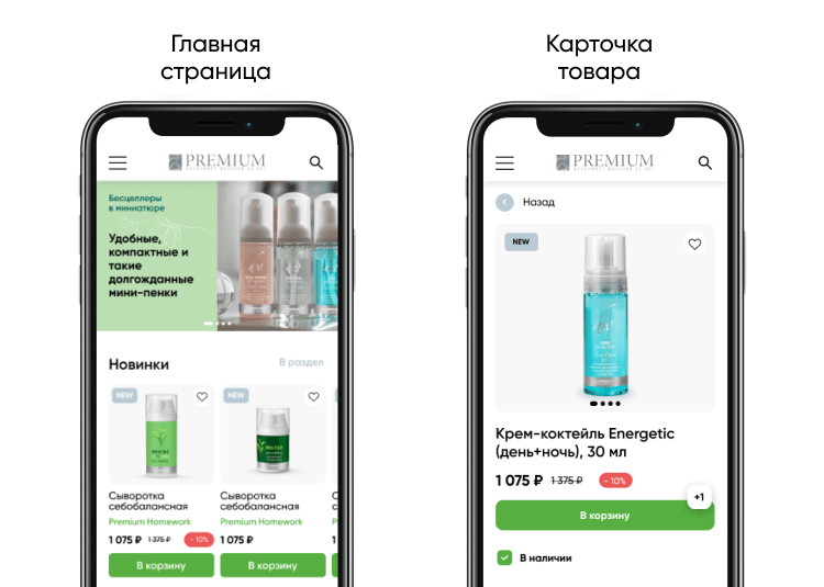Пример реализации главной страницы и карточки товара в мобильной версии