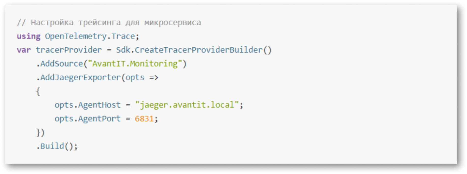 Для настройки трейсинга можно использовать OpenTelemetry — это универсальный стандарт, который применяется даже в сложных .NET-средах. Например, следующий код интегрирует Jaeger в микросервис, чтобы каждый запрос оставлял «след» для анализа: