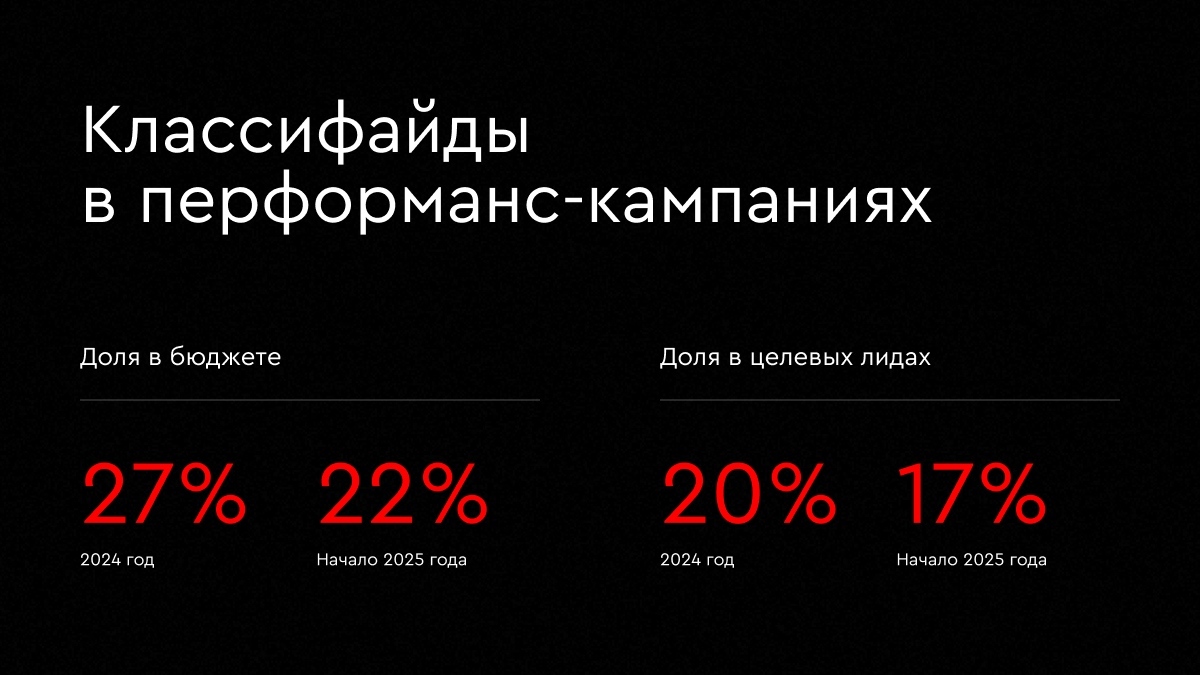 Анализ данных агентства за 2024–2025 годы показывает, что классифайды сохраняют значимую роль в структуре перформанс-кампаний. По итогам 2024 года доля классифайдов в общем бюджете составляла 27%, а в доле целевых лидов — 20%. В январе–феврале 2025 года эти показатели скорректировались: классифайды заняли 22% в структуре бюджета и 17% в целевых лидах.