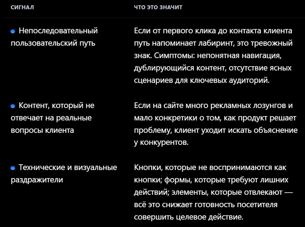 Если объяснение расплывчатое или неуверенное, это сигнал, что сайт не доносит ключевые ценности и усложняет понимание предложения.
