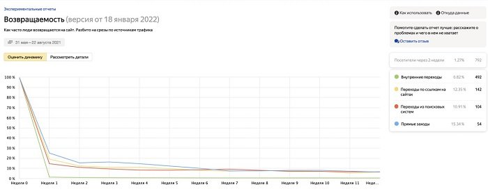 Показывает, как новые посетители из различных источников привлечения возвращаются на сайт, поэтому он полезен для тех сайтов, где есть повторные посещения. Данные собираются по всем посетителям, которые впервые пришли на сайт в течение указанного времени, и динамике их возвратов в течение 13 недель.