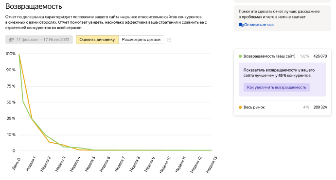 Позволяет сравнить возвращаемость посетителей вашего сайта со средней по рынку. Чем чаще пользователи возвращаются на сайт, тем выше их интерес и лояльность к вашему предложению.