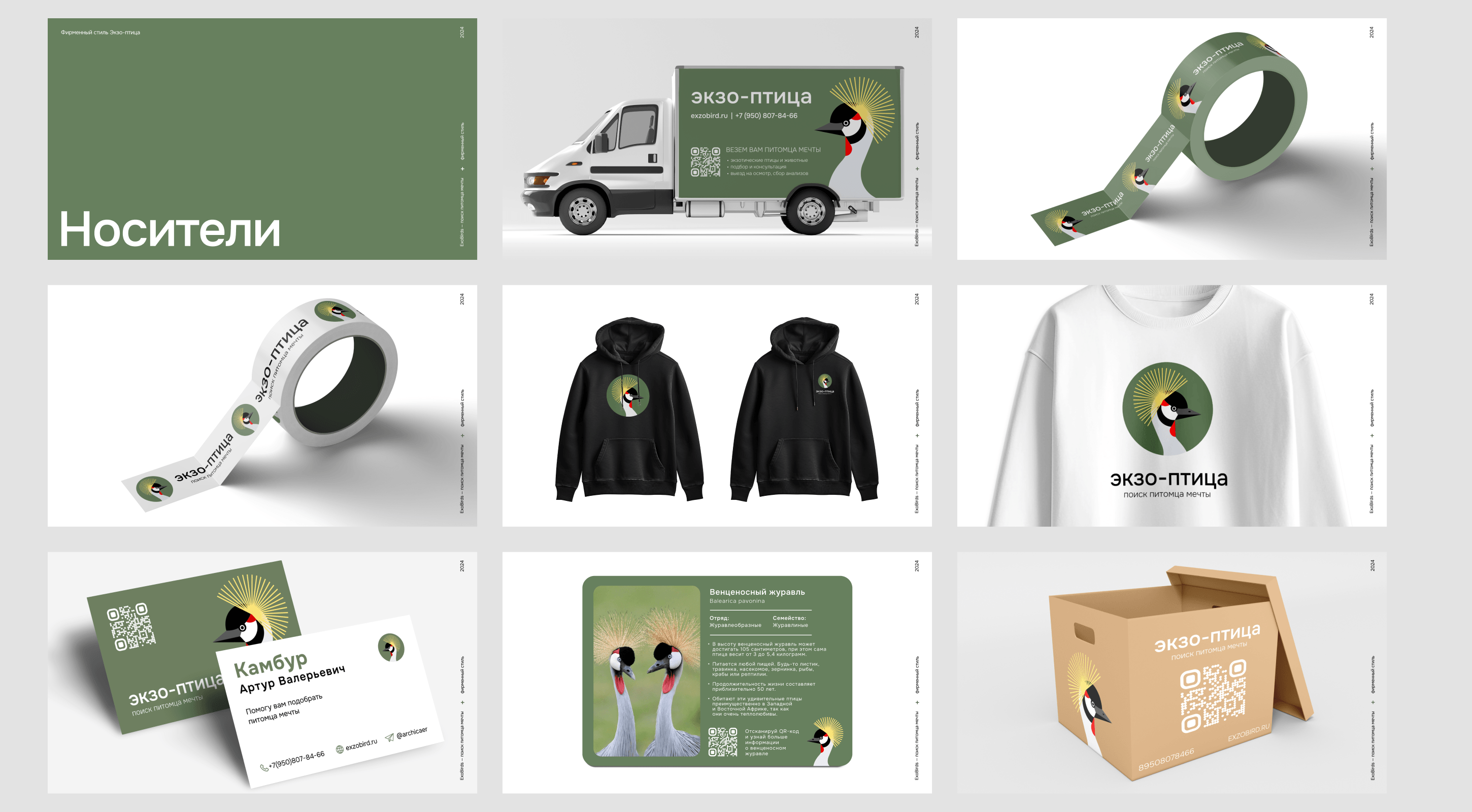 В фирменном стиле отразили экзотичность животных, которых подбирает заказчик. Изначально было несколько концепций с разными птицами: куриным гусём, журавлём и яйцами.