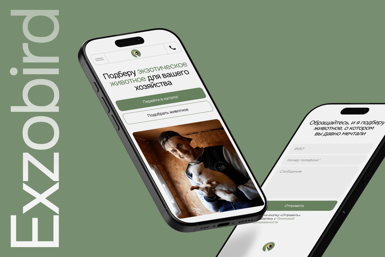 У каждого раздела: подбора животных, дополнительных услуг, доставки и отзывов есть уникальный визуал, который глубже погружает в атмосферу Exzobird и помогает понять все нюансы работы.