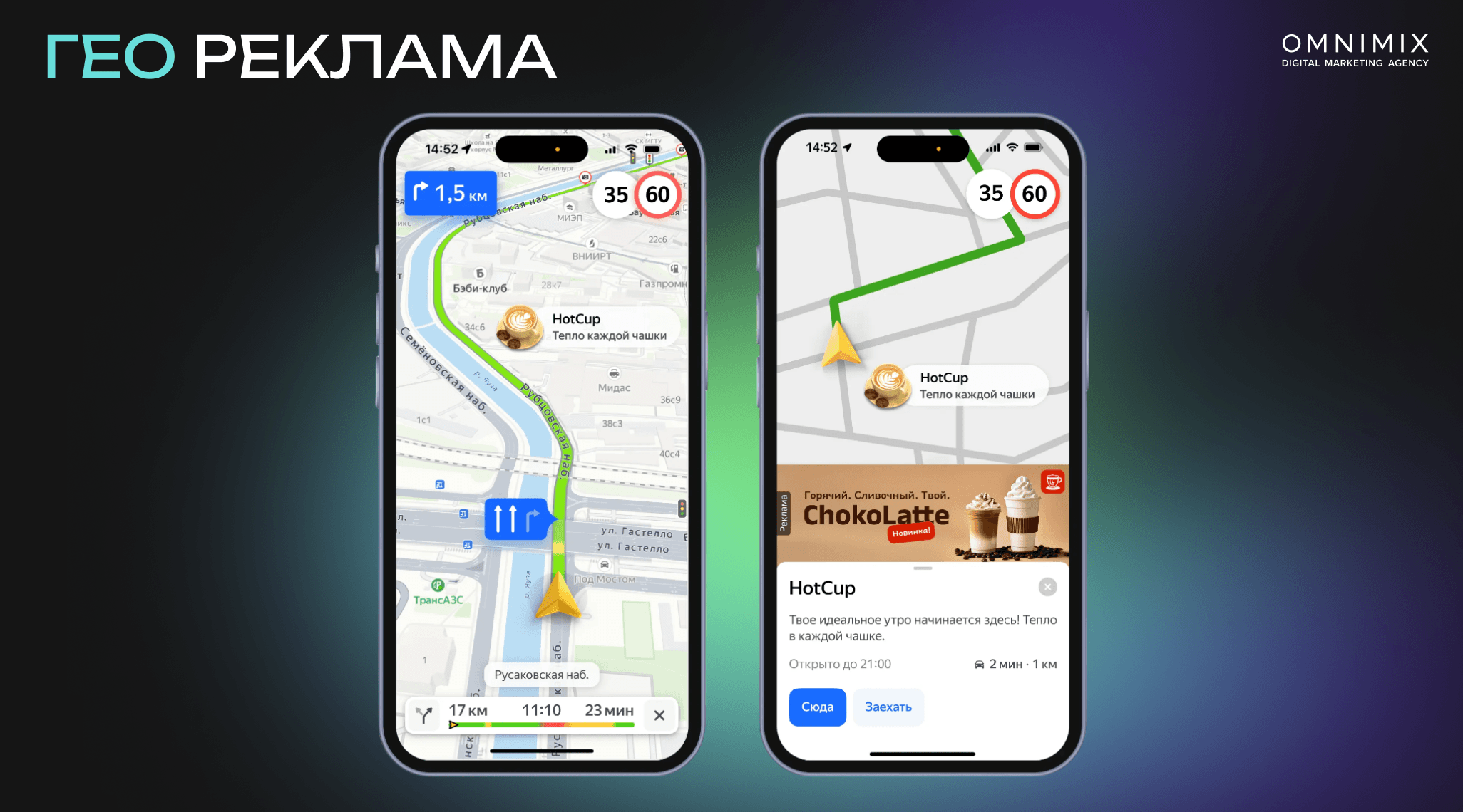 В России такие подходы используют как крупные, так и небольшие локальные бизнесы. Например, если человек оказался в 500 метрах от кофейни, он может увидеть рекламу с персональным предложением в соцсетях или навигаторе. Такая реклама выглядит уместно и естественно — как часть повседневного цифрового опыта — и приносит результат: люди зачастую переходят по ссылке и заходят в заведение.