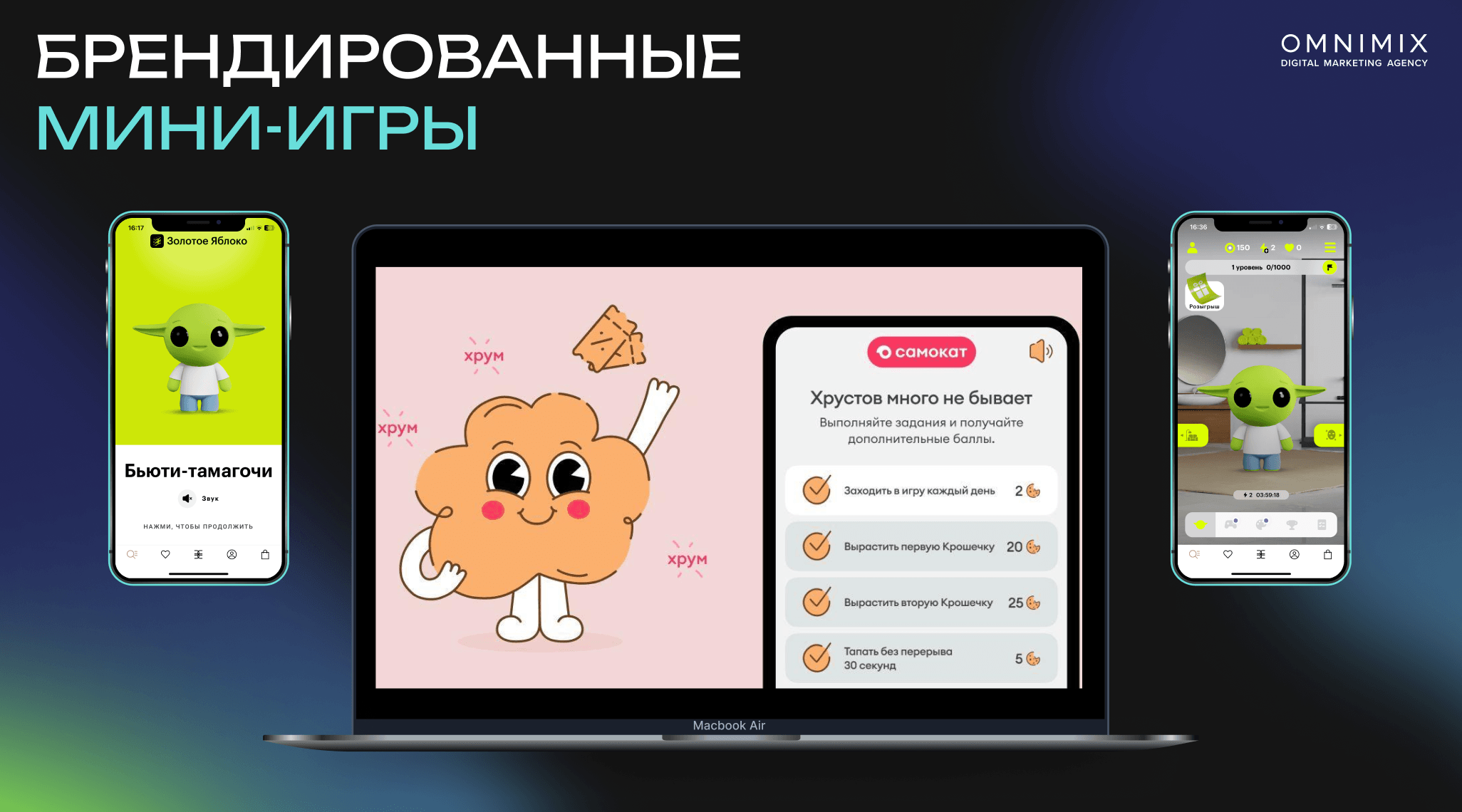 Разновидностью метаигр становятся брендированные мини-игры, интегрированные прямо в приложение компании. Примером служат такие инициативы, как запуск Tamagotchi в приложении Золотого Яблока или Крошечка от Самоката, где пользователь взаимодействует с виртуальным питомцем, а заодно знакомится с ассортиментом магазина.