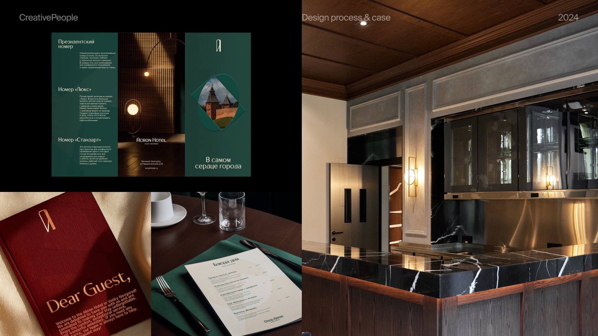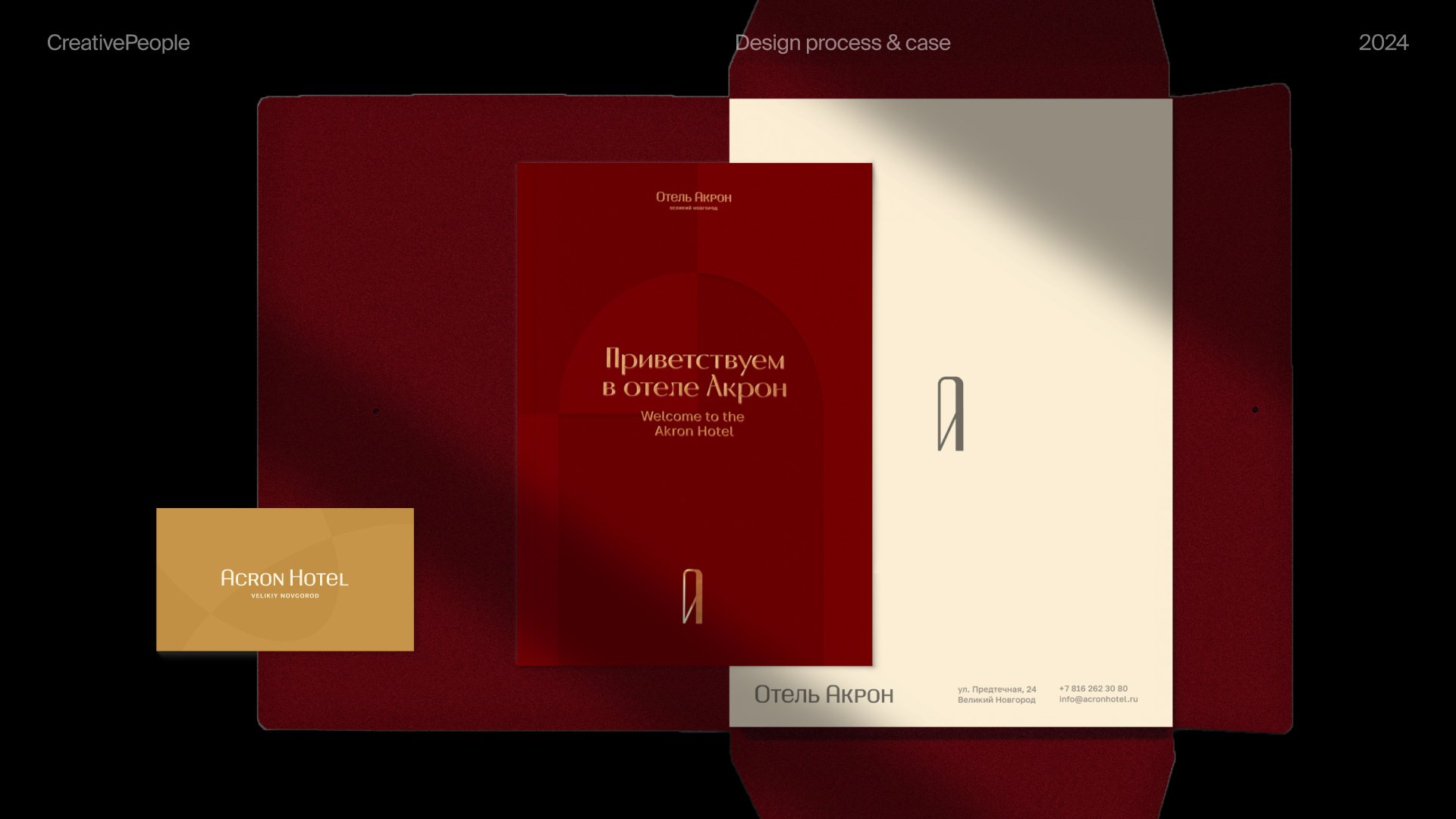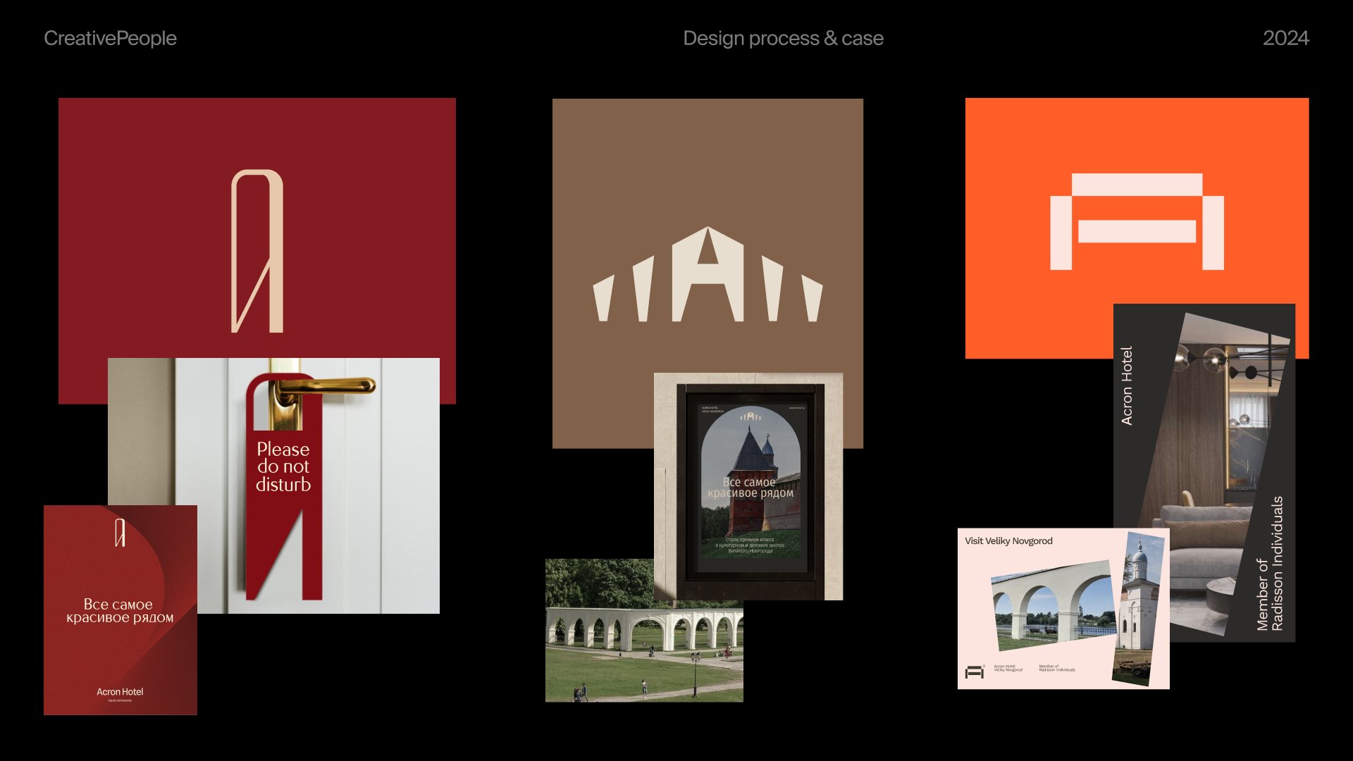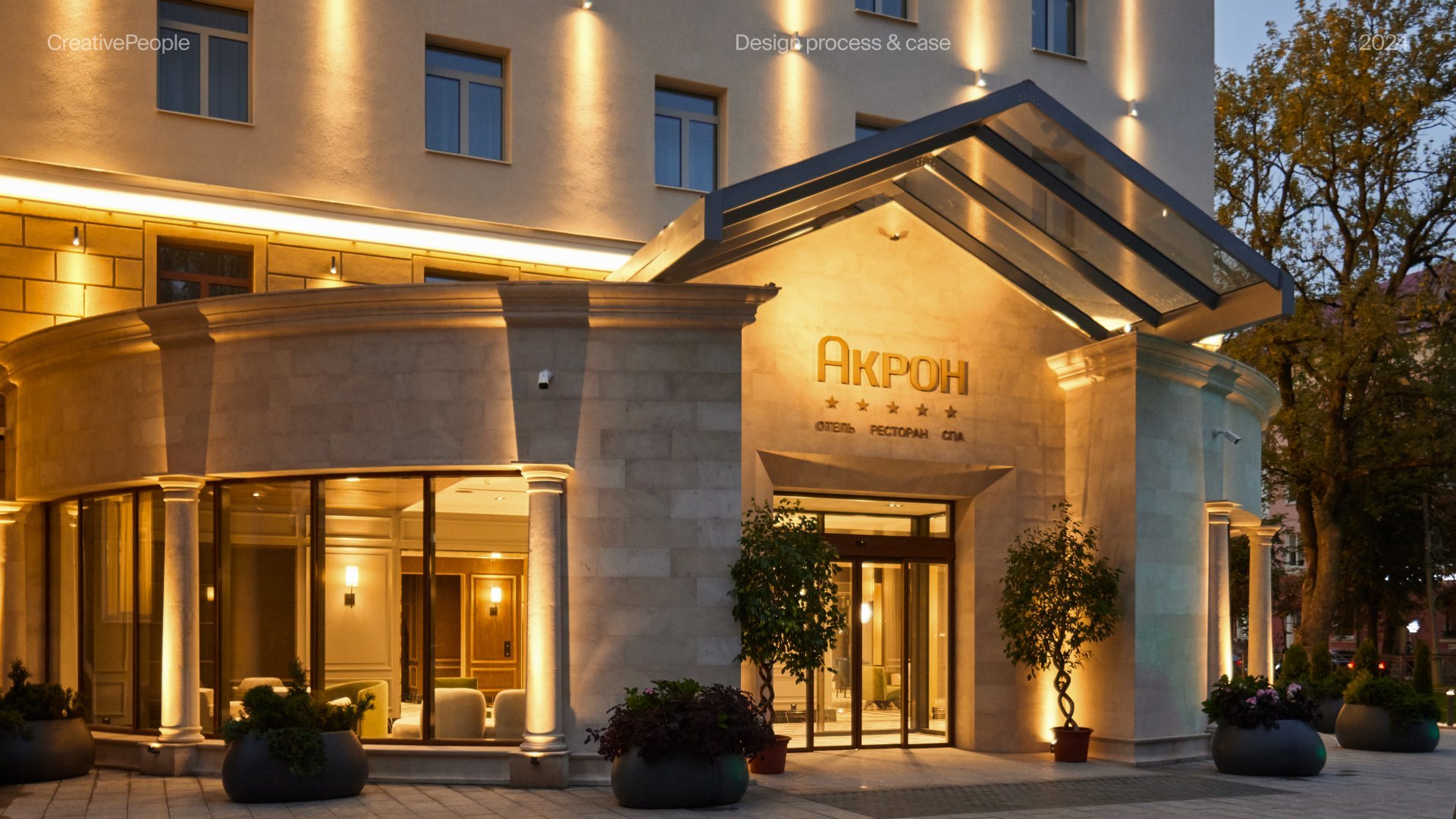 К нам в CreativePeople обратился отель «Акрон», которому в ходе ребрендинга нужно было создать статусную айдентику, соответствующую пятизвёздочному отелю. Изменения произошли значительные: двухзвёздочная гостиница превратилась в бутик-отель по стандартам Radisson Individuals. Вау. Поэтому пришли к нам, опытным ребятам, которые знают, что важно подчеркнуть в премиум-сегменте.