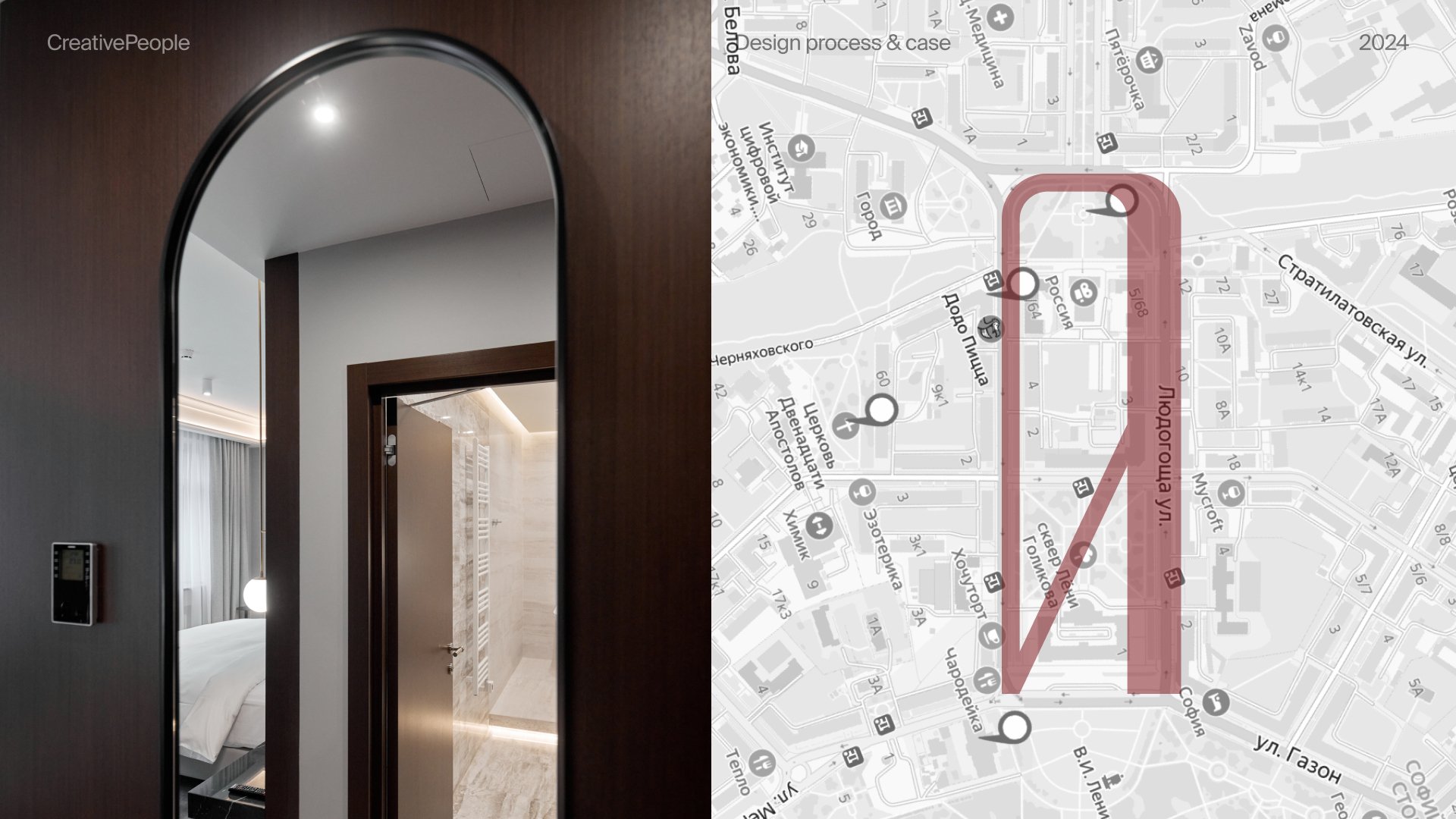 Мы подходили к работе системно и работали спринтами, обсуждали дизайн в моменте, за счёт чего согласование с клиентом проходило легко. Отдельно проработали момент с оформлением вывески отеля, чтобы учесть технические требования к историческим вывескам в городе.